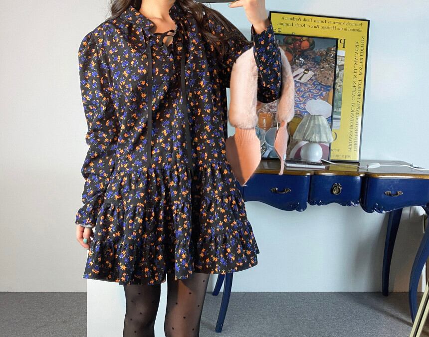 スプリングスタイルカラーレースルーズロングプリーツフローラルドレス ショートスカート レディース 長袖 春物 花柄 韓国婦人11907565504