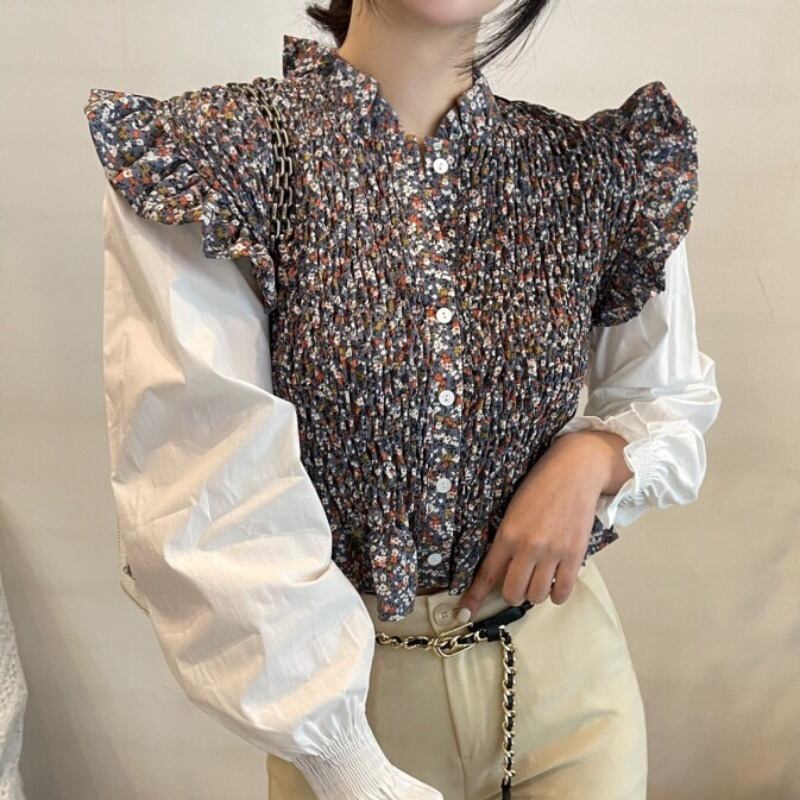 スタンダードブラウス フローラルシャツ スリムプリーツスプリング レトロ 春物 花柄 ステッチ 韓国婦人27109926171