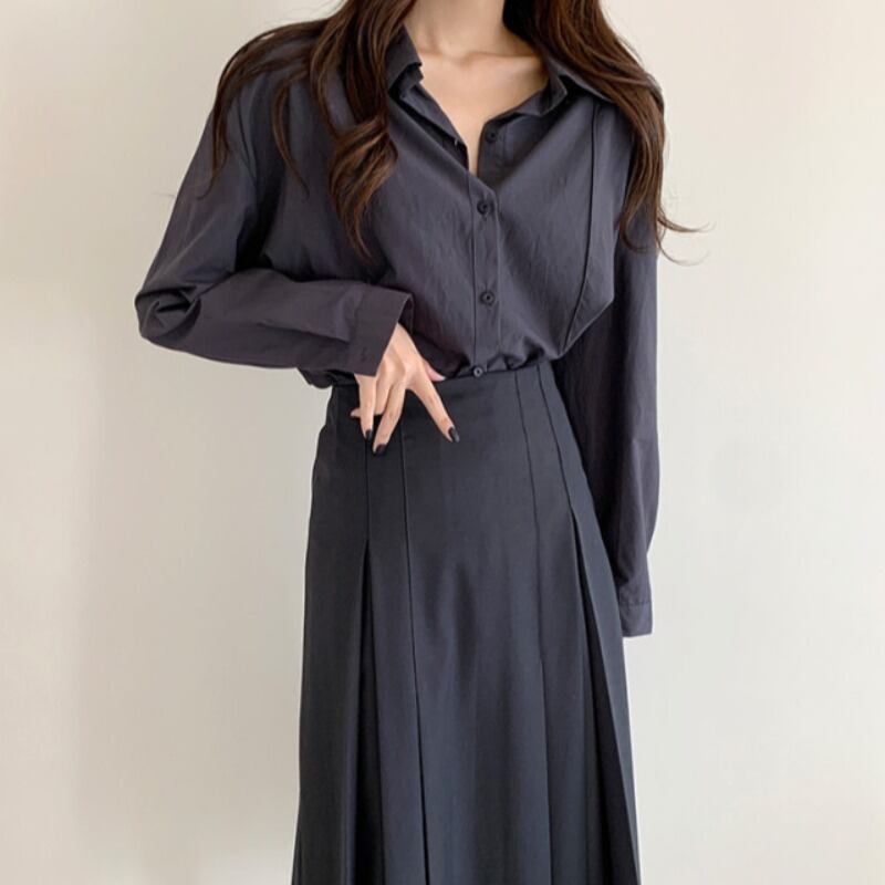 オータムシャツ ハイウェストプリーツスカート ロング 秋物 韓国婦人9876814300