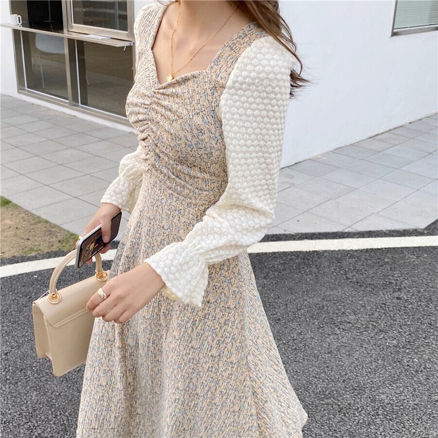 オータムウィンターフローラルドレス レーススカート ロング 秋物 冬物 花柄 ステッチ 韓国婦人98244002040