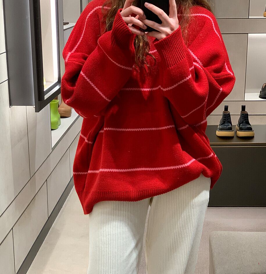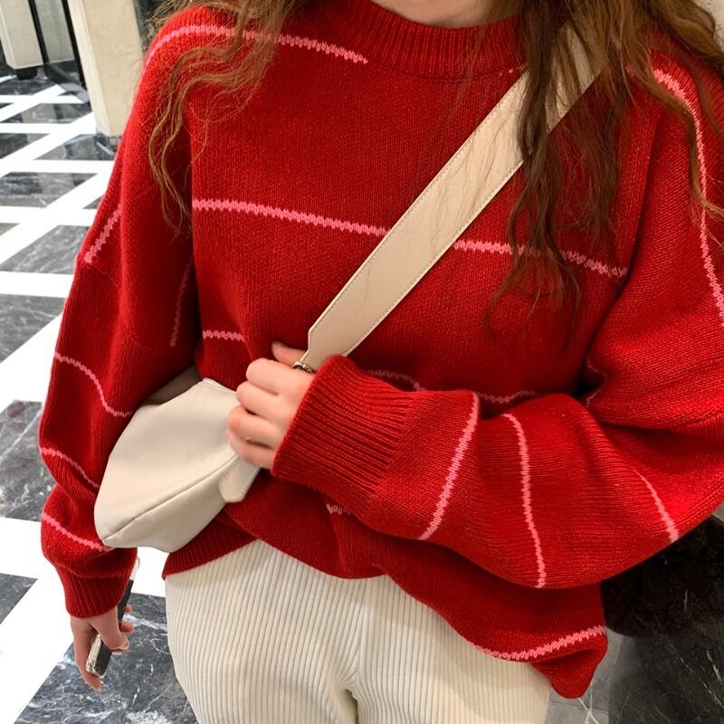 レッドストライプセーター ルーズラウンドネックプルオーバー トップス ロング Oネック 韓国婦人19655272903