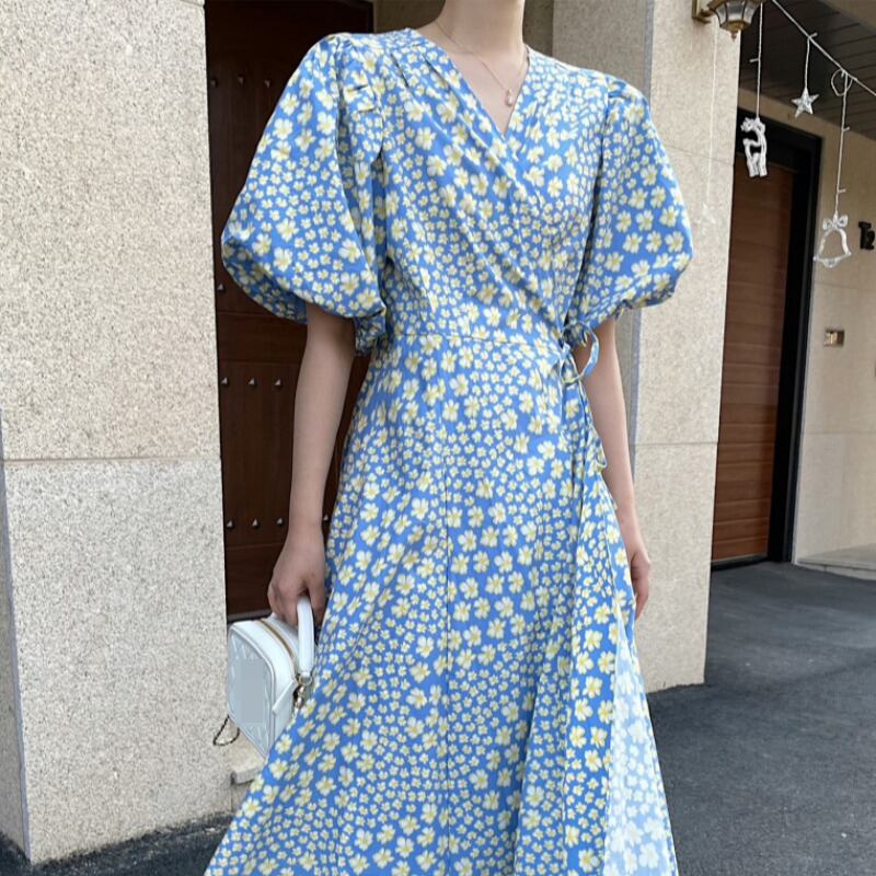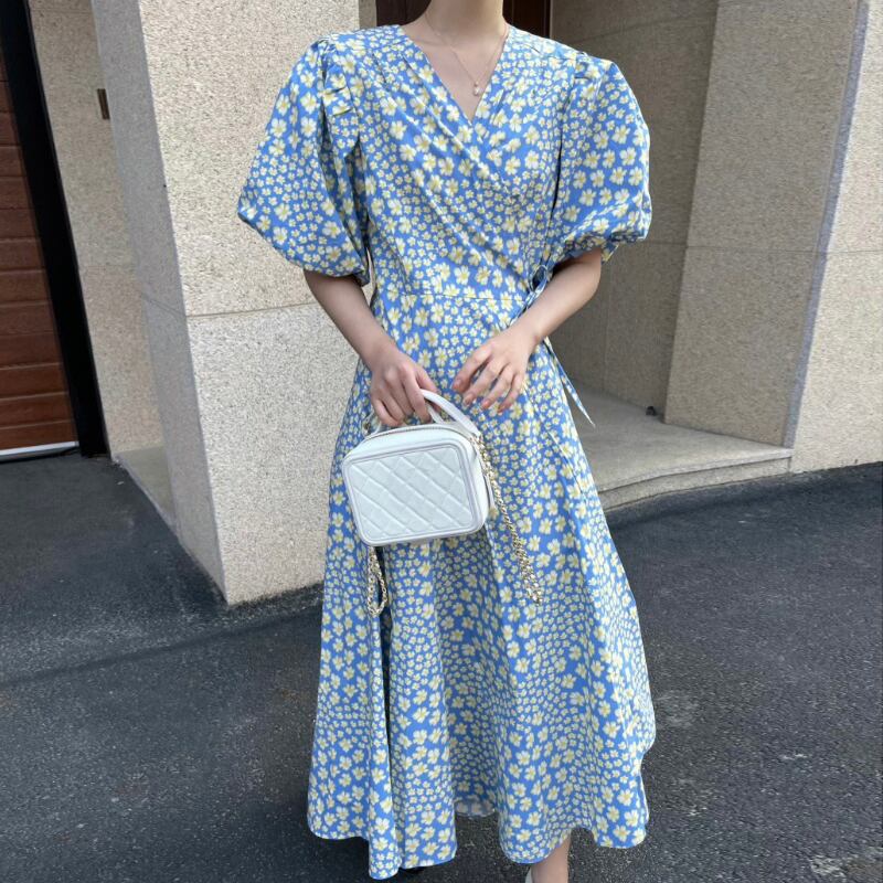 フローラルドレス サマーバンドスリーブウェスト薄手Vネックスカート 夏物 花柄 韓国婦人83991649205