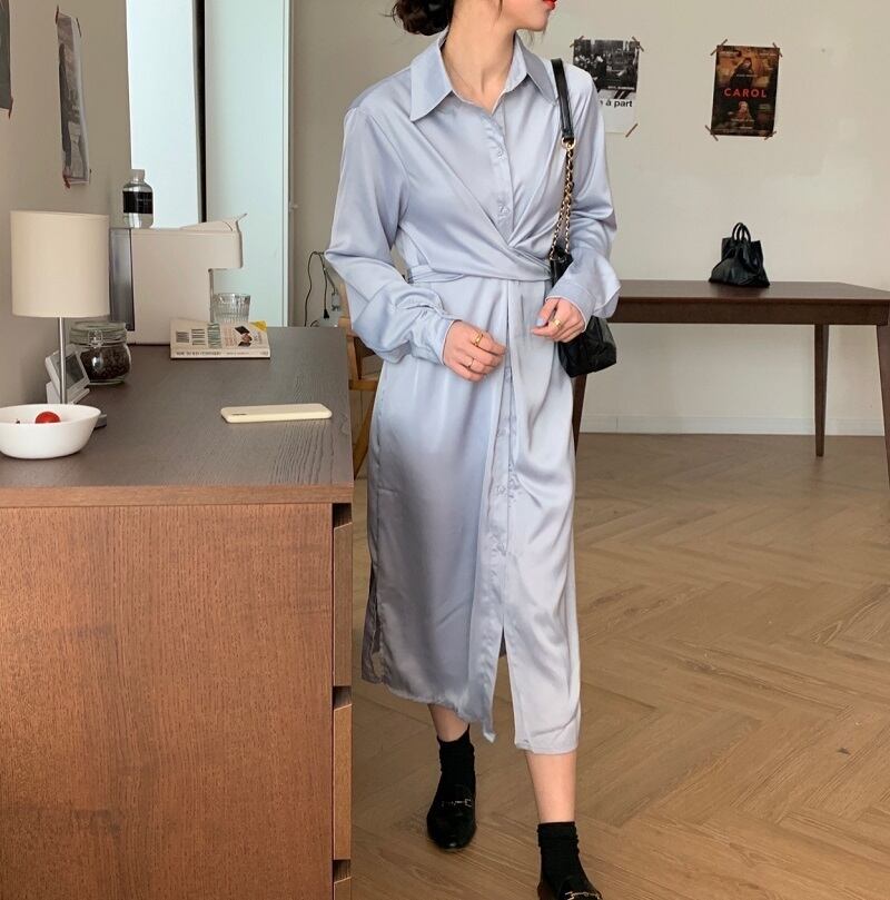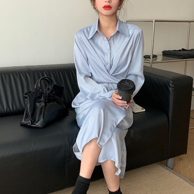 ブルーシャツ ドレス スプリングクロスレースロングスカート 春物 韓国婦人75527580917