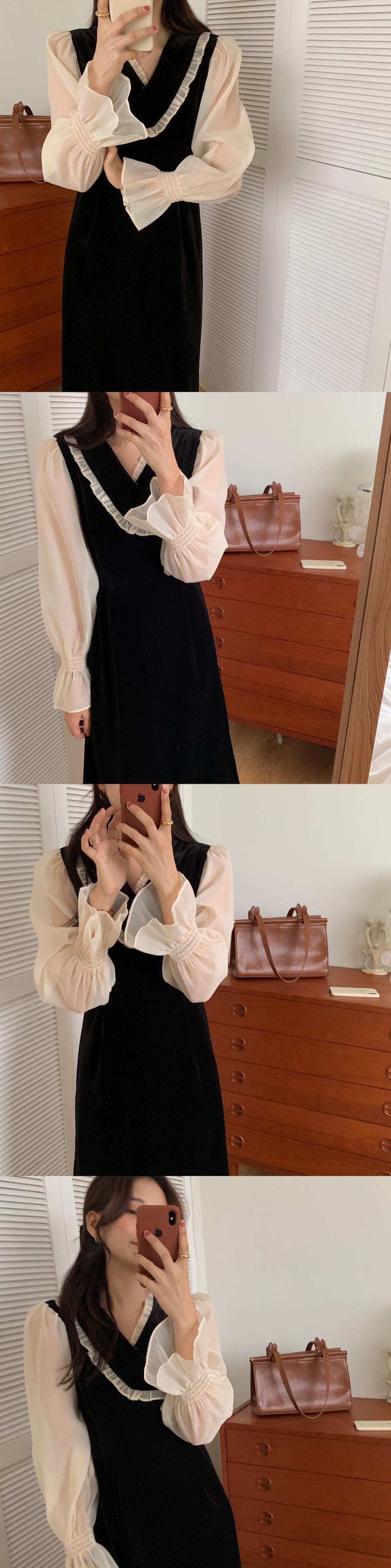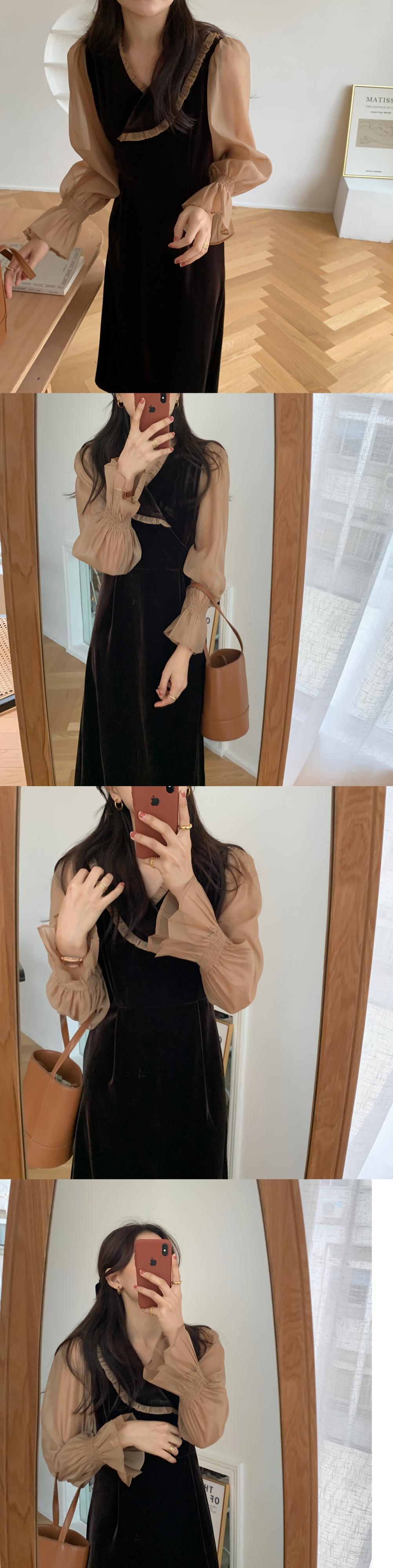 スタンダード薄手Vネックスリーブベルベットドレス ロングスカート レッド レトロ ステッチ 韓国婦人86804608011