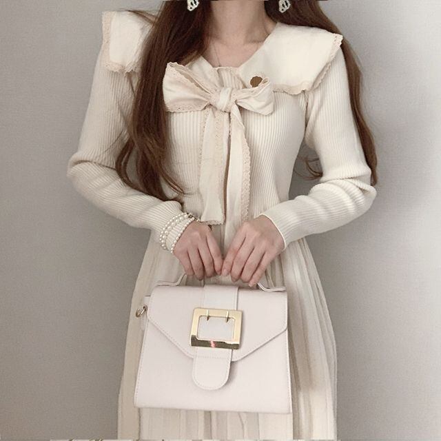 スタイルスタンダードレースプリーツニットドレス リボンレディース レトロ オータム 秋物 ウィンター 冬物 韓国婦人91219177693