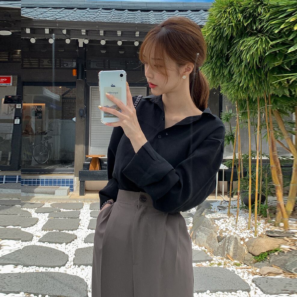ミニマリストソリッド カラーシャツ スタンダードスリムハイウェストウェストパンツ レトロ ソリッドカラー 韓国婦人37634101488