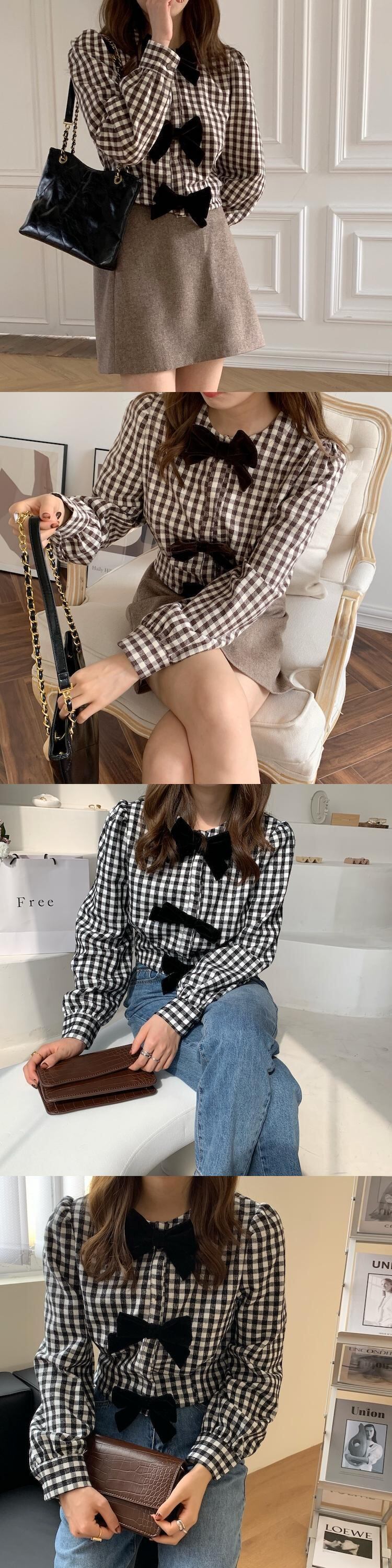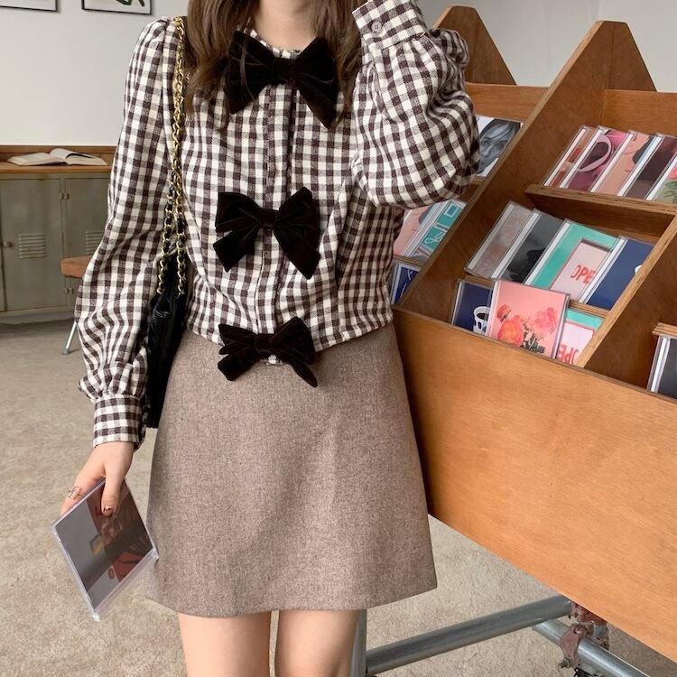 スプリングシャツ スタイルリボンスタンダード格子柄ショートトップス レディース レトロ 春物 韓国婦人69579013707