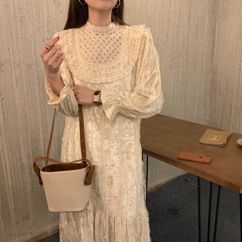 オータムウィンターレースカラー薄手ベルベットドレス レディース 秋物 冬物 韓国婦人41233227444