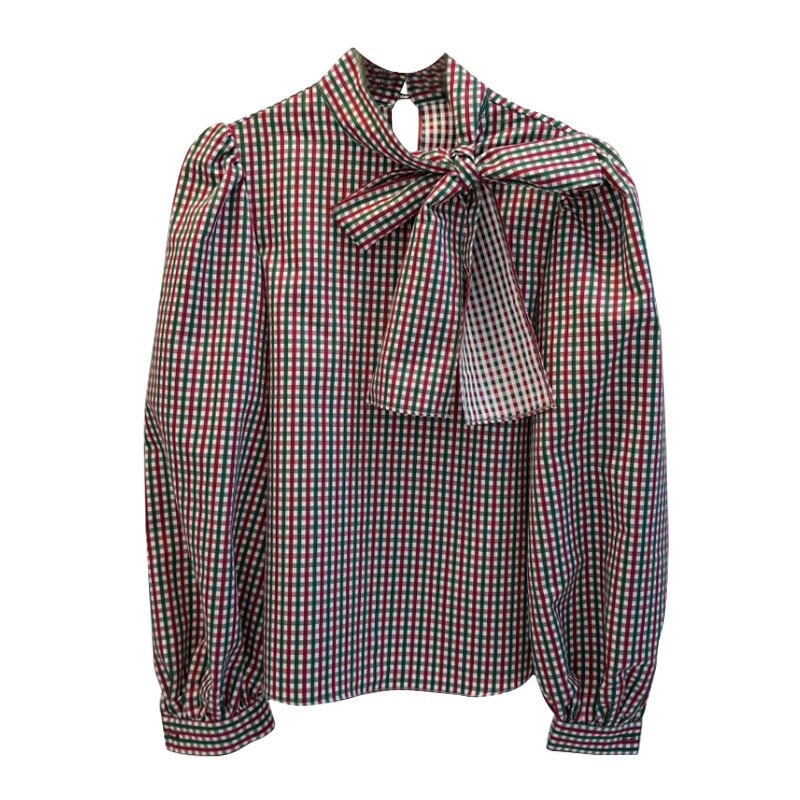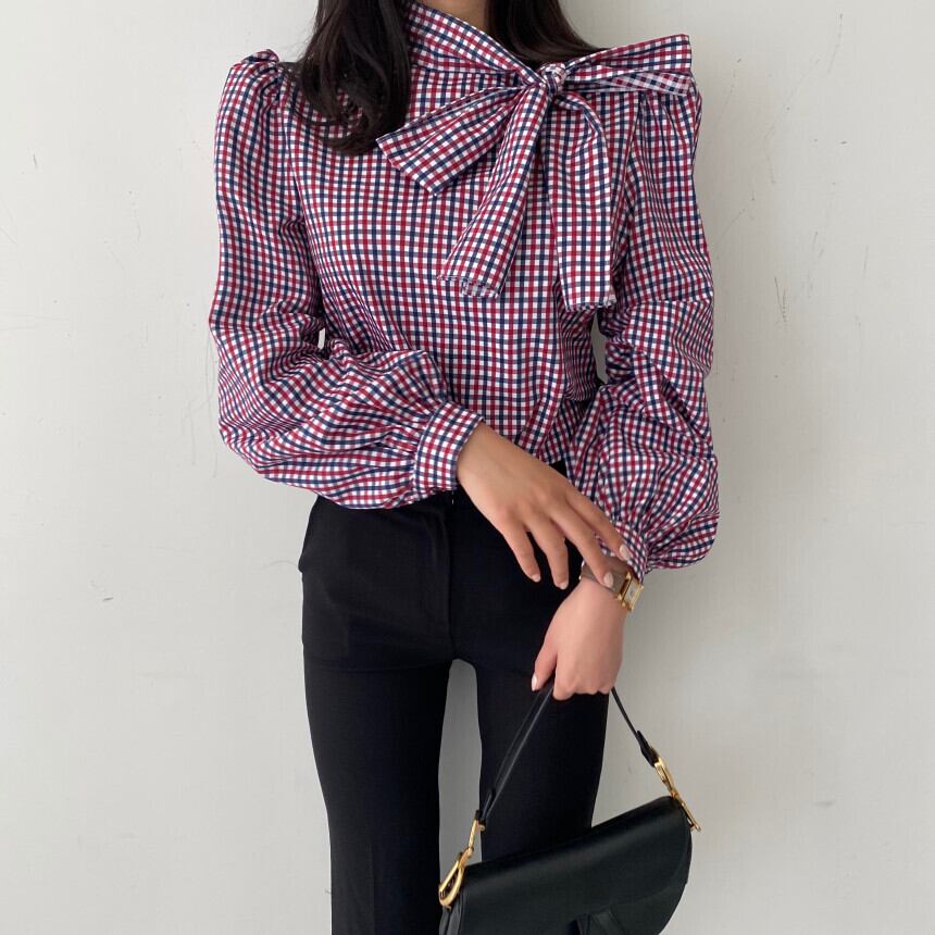 スタイルリボンルーズスリーブ格子柄シャツ レディース エレガント 韓国婦人6778705298
