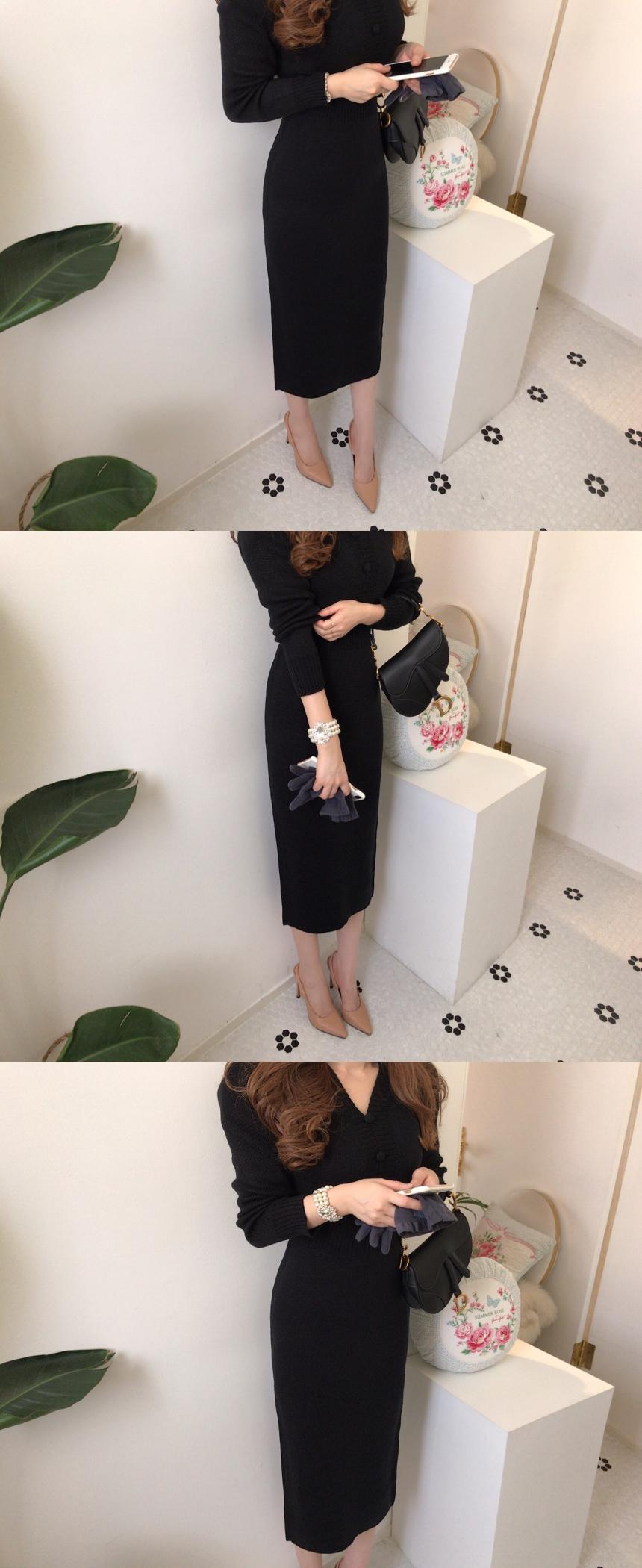 オータムウィンタースタイルVネックバックルウェストニットドレス 薄手スカート ロング 秋物 冬物 韓国婦人6550809831