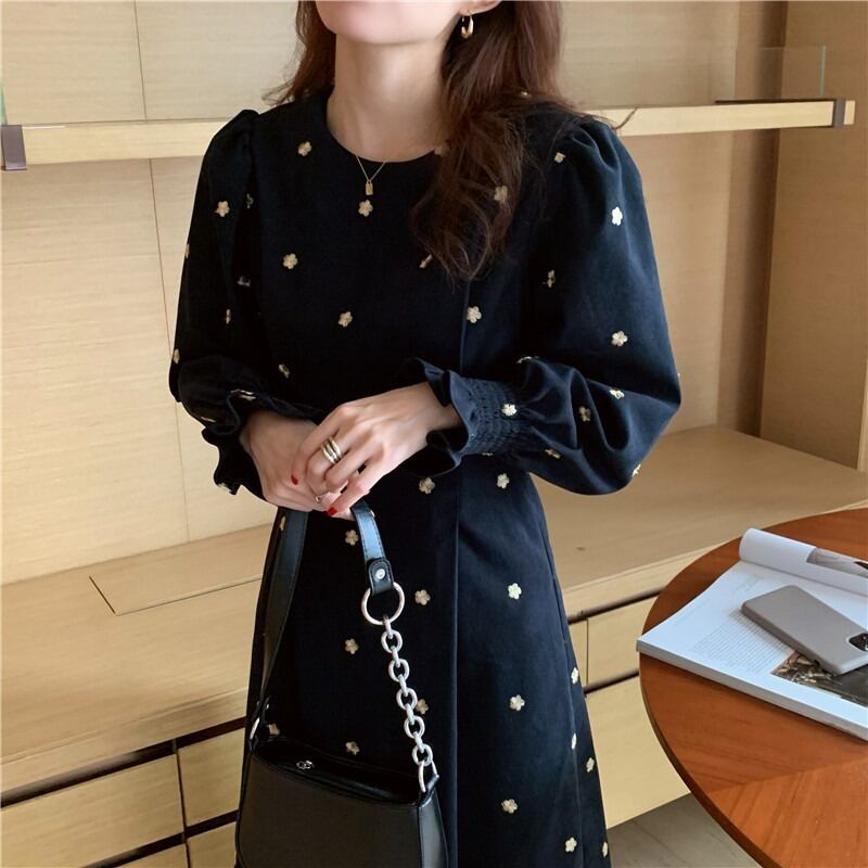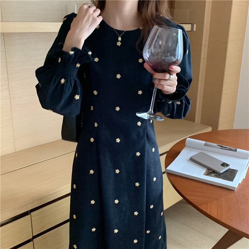 スプリングラウンドネックウェストスリムスタンダードドレス 刺繍スカート レトロ 春物 Oネック 韓国婦人58446693378