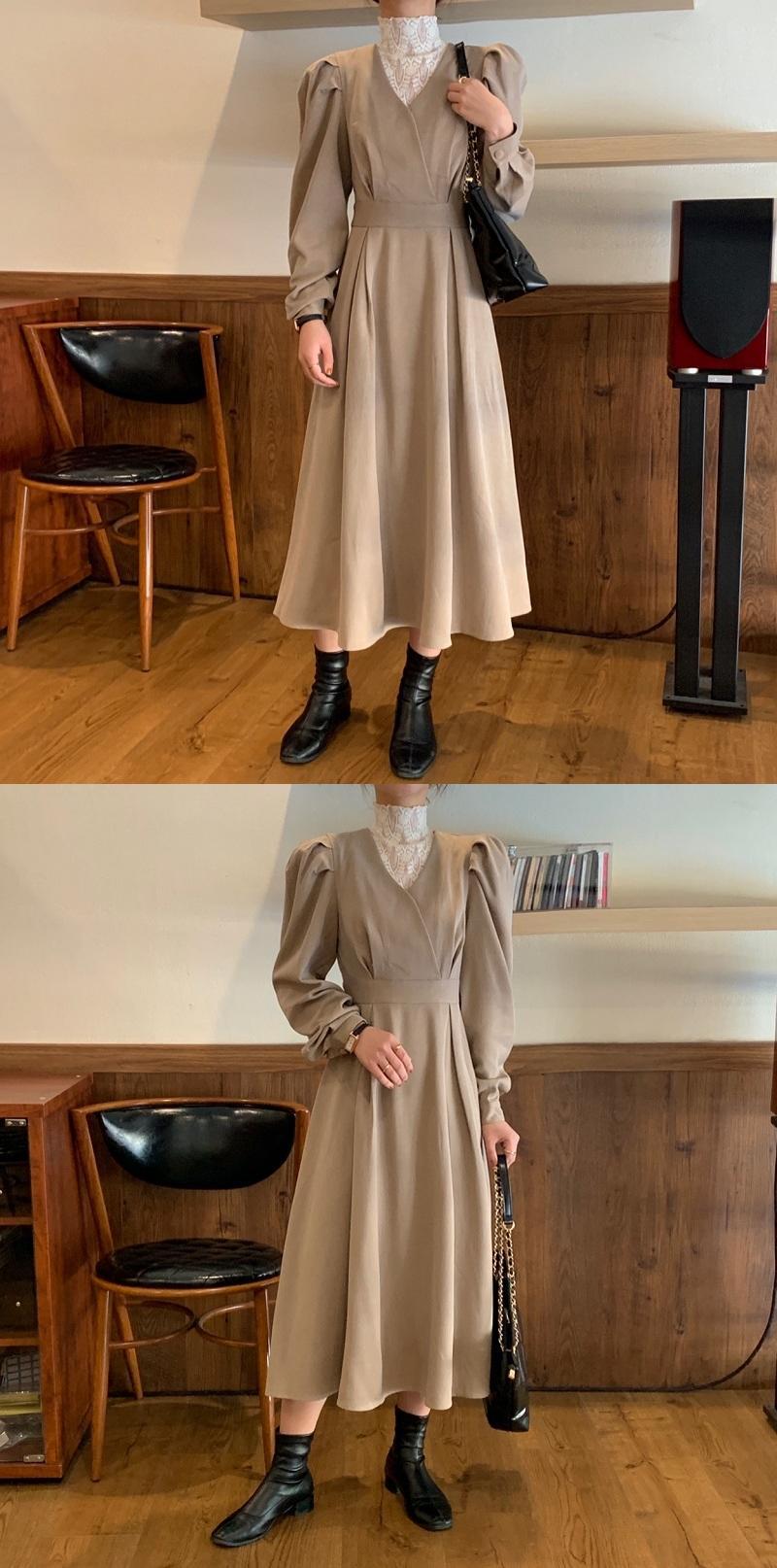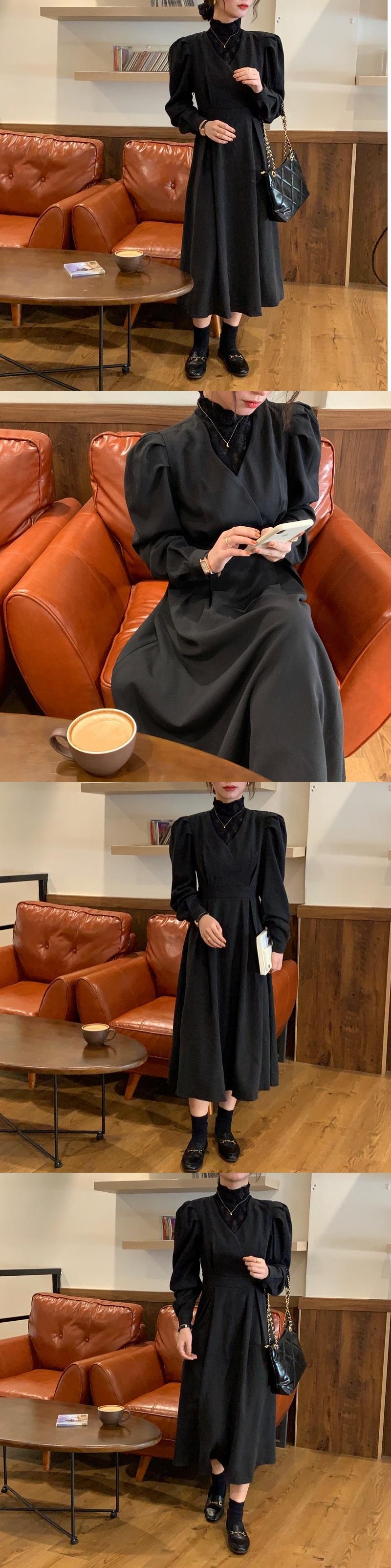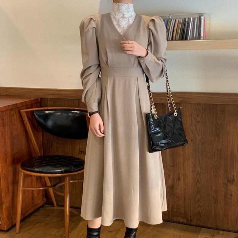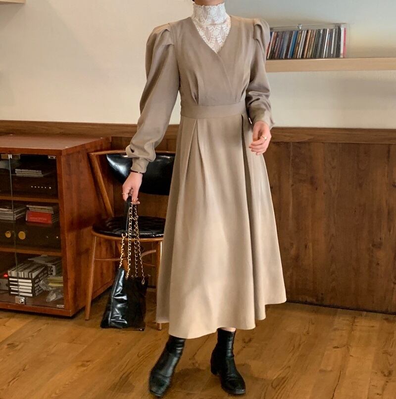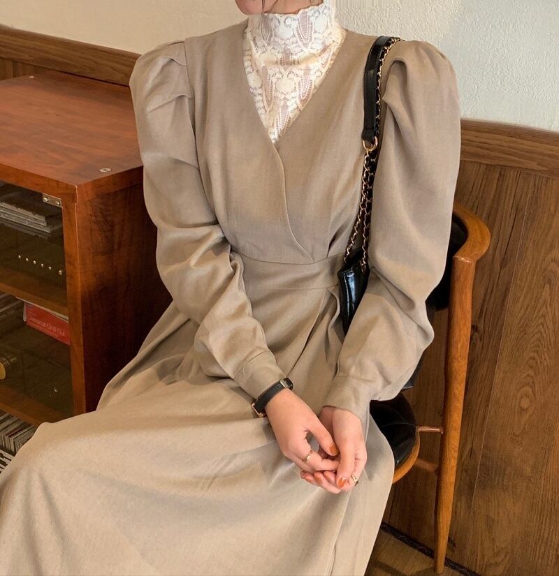 スタンダードレースカラーオータムウィンタースリーブスカート ドレス レトロ 秋物 冬物 ステッチ 韓国婦人80684020480