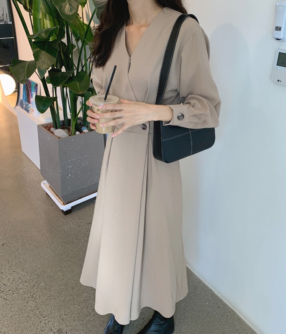 Vネックプリーツロングレディース 韓国婦人15706952597
