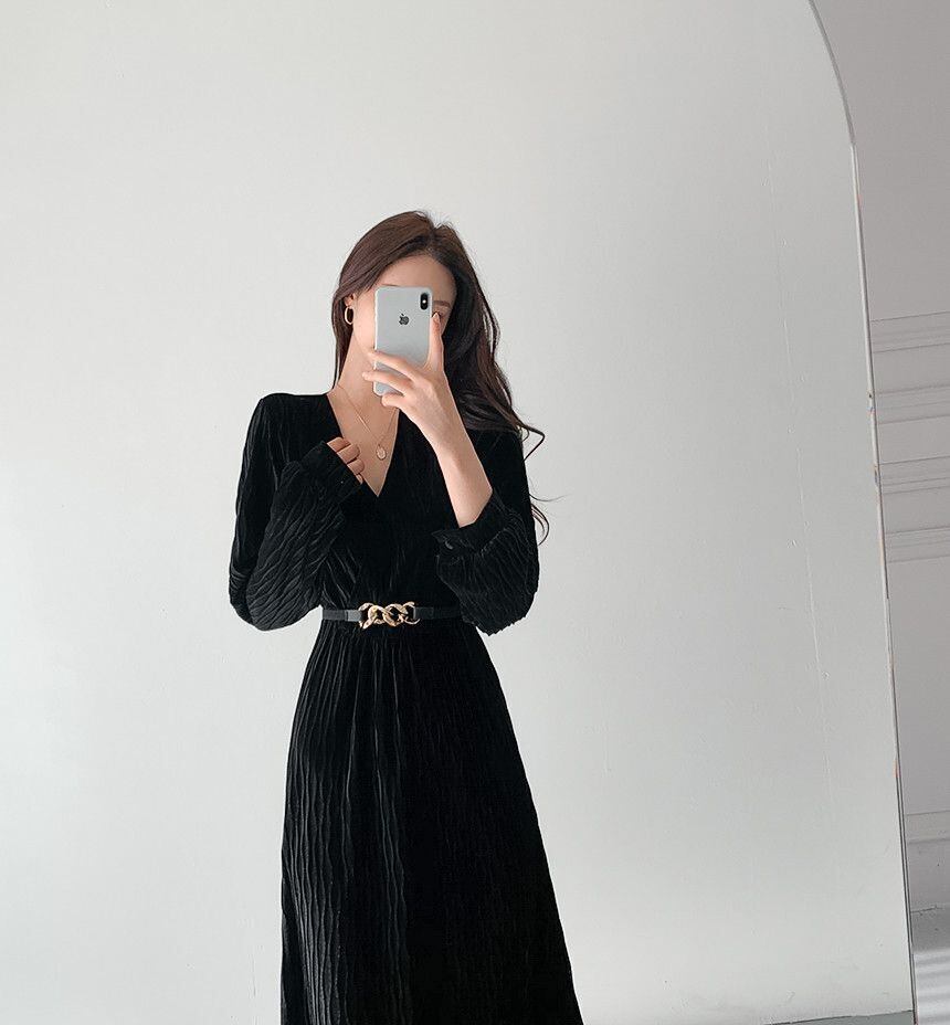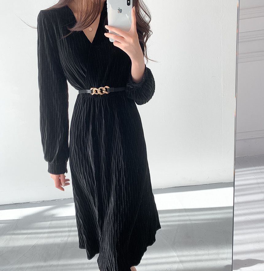 Vネッククロスベルト スリムプリーツドレス スプリング エレガント 春物 ハーネス 韓国婦人19975416914