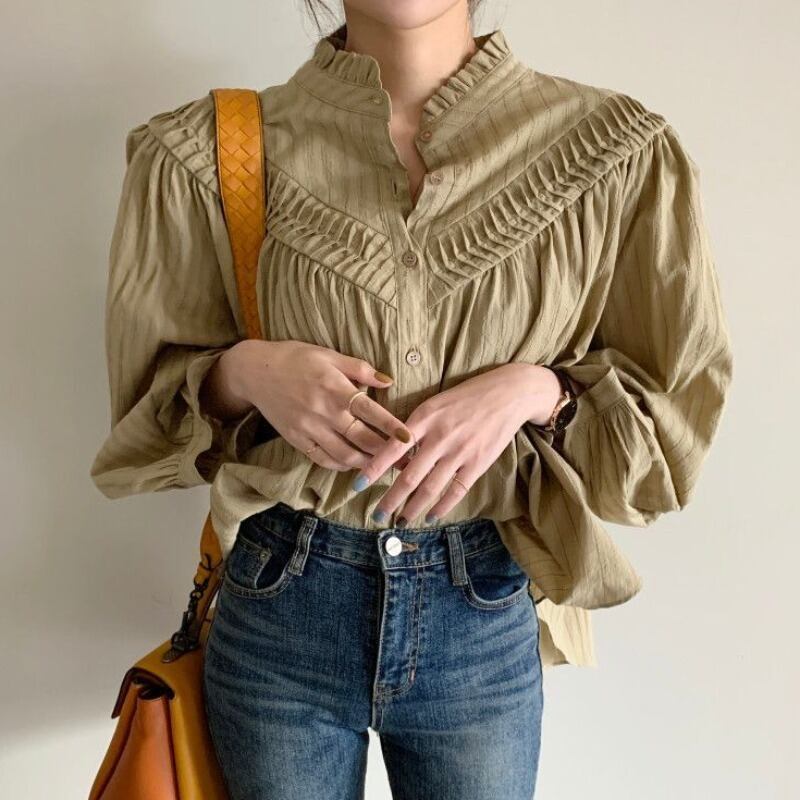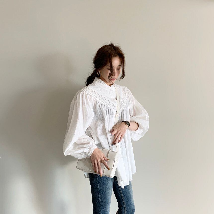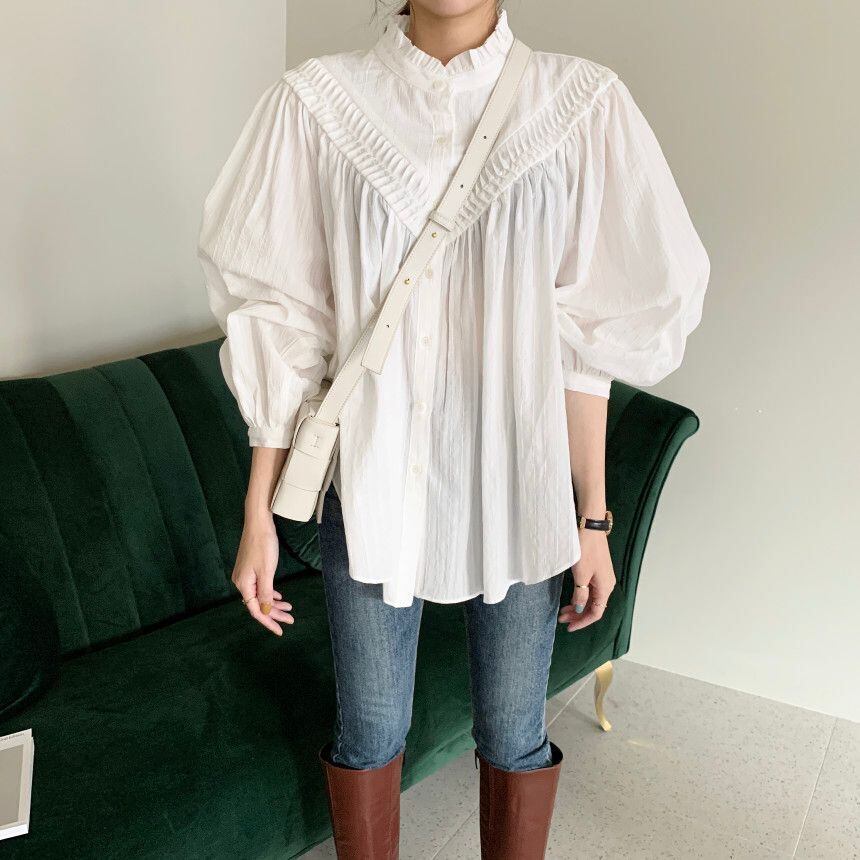 トップス オータムスタイルスタンドカラーカラープリーツルーズスリーブシャツ ランタンスリーブ 秋物 韓国婦人47849042009