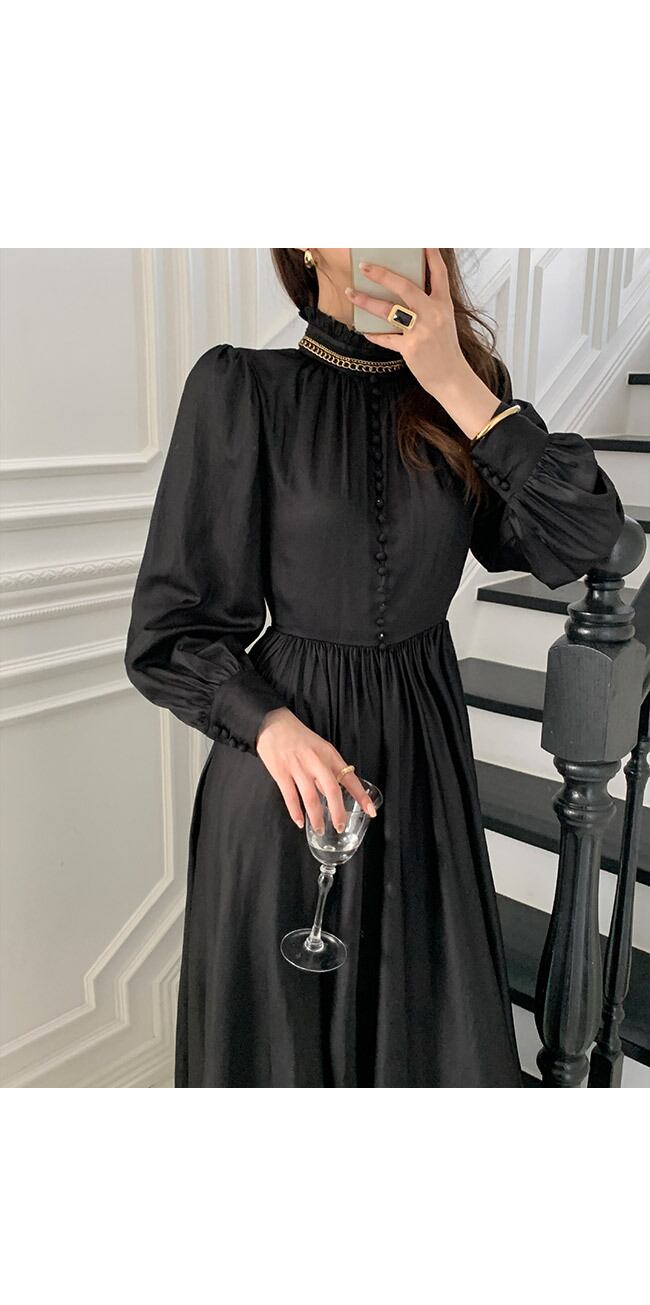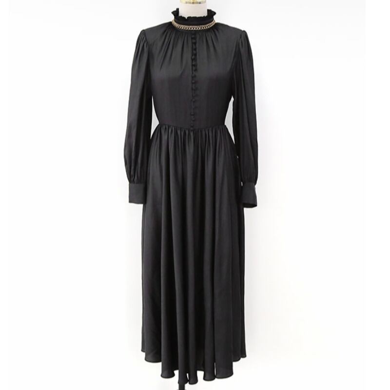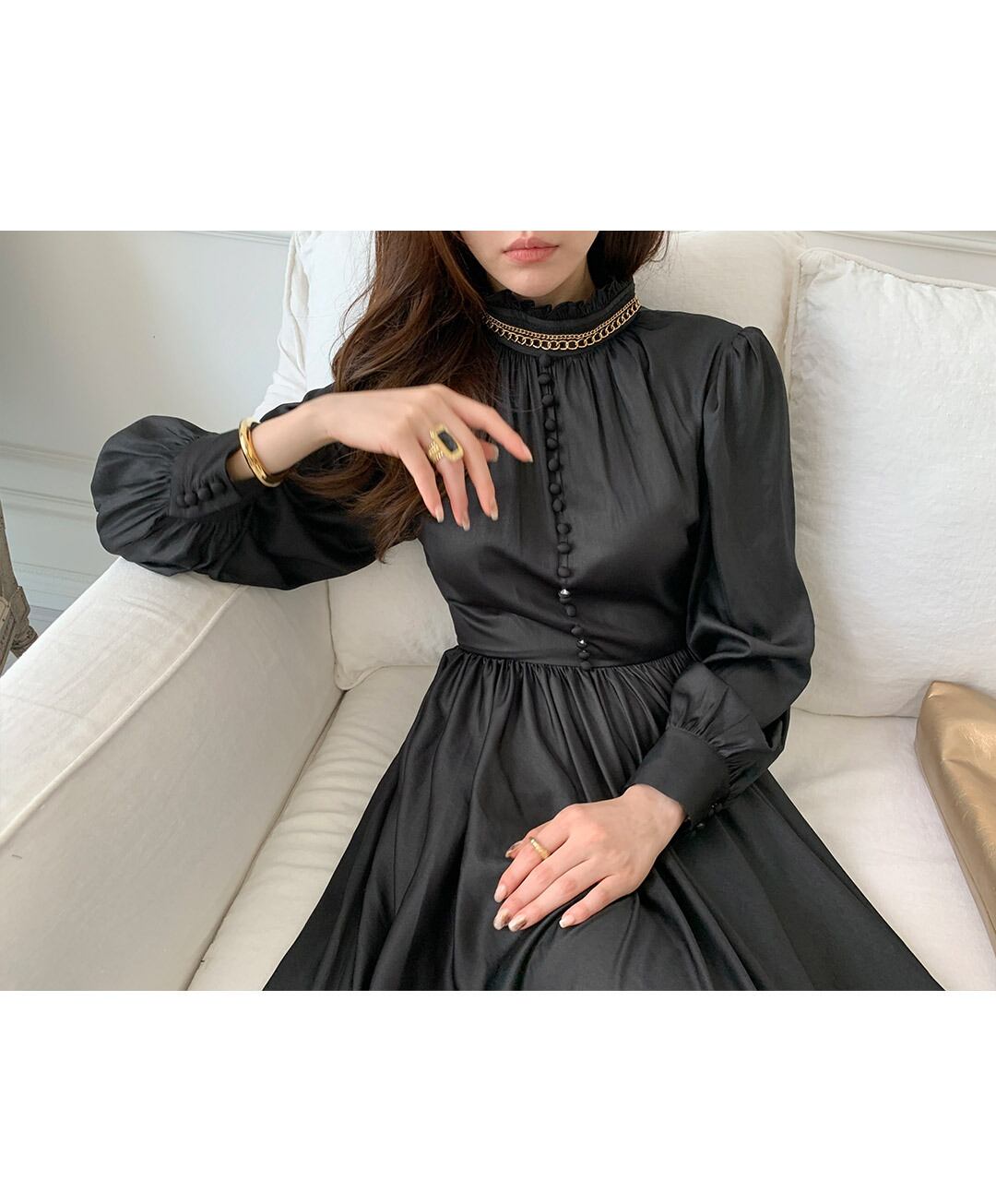 スプリングオータムブラックウェストスカート スリーブドレス レディース エレガント 春物 秋物 韓国婦人24296924150