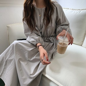 プリーツスリーブウェストドレス レディーススプリングオータムスタンダードスカート ランタンスリーブ レトロ 春物 秋物 韓国婦人13993678340