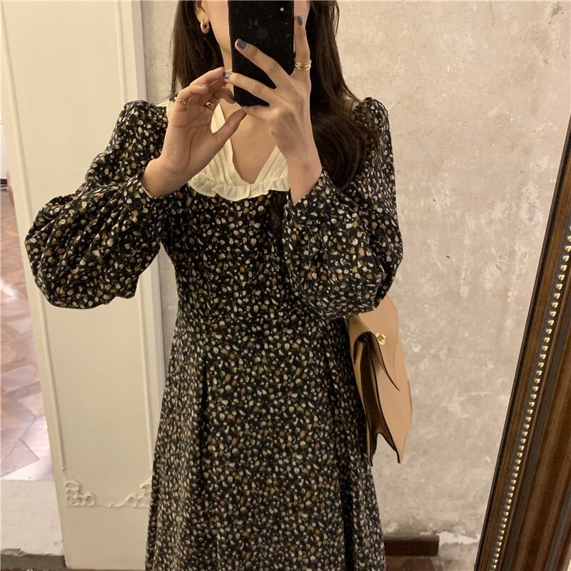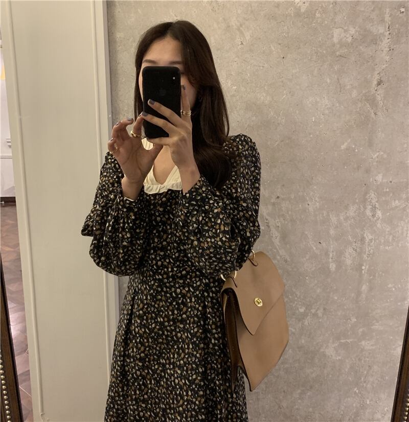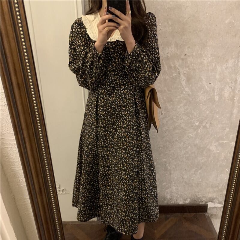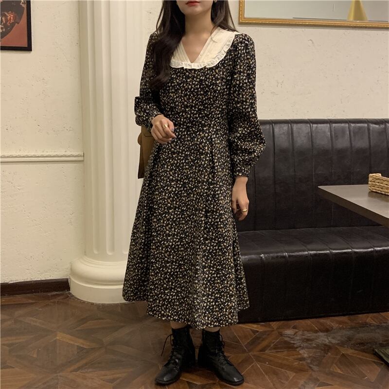 スタイルコーデュロイフローラルプリント柄ウェストドレス カラーロングスカート レディース 花柄 韓国婦人87790514980