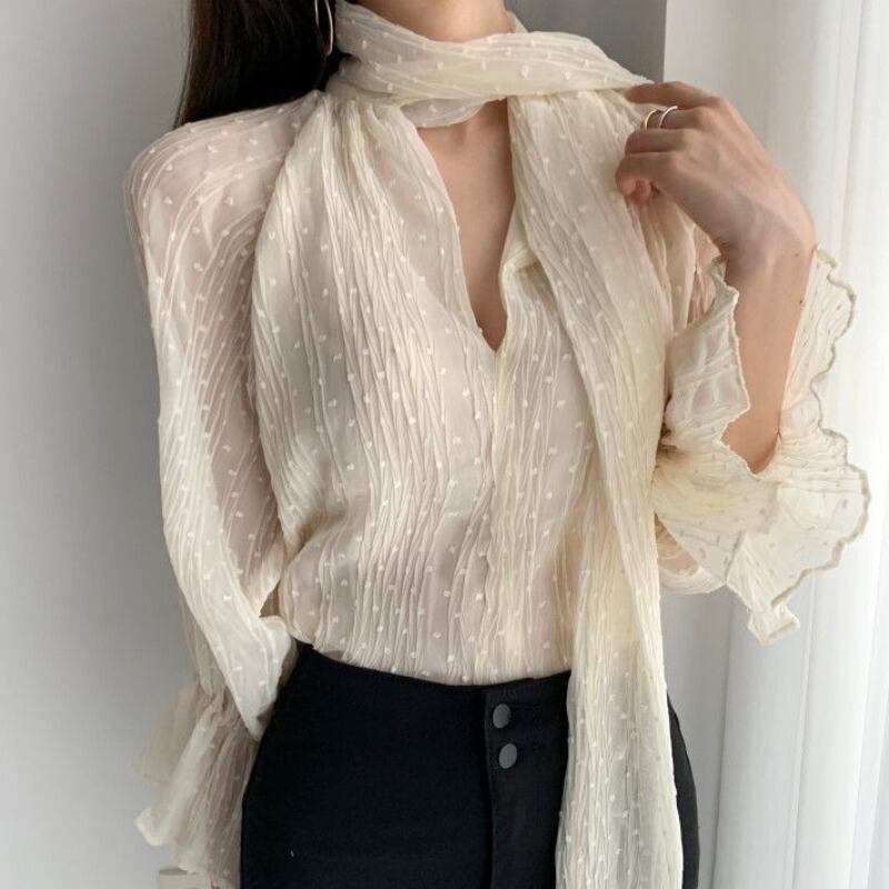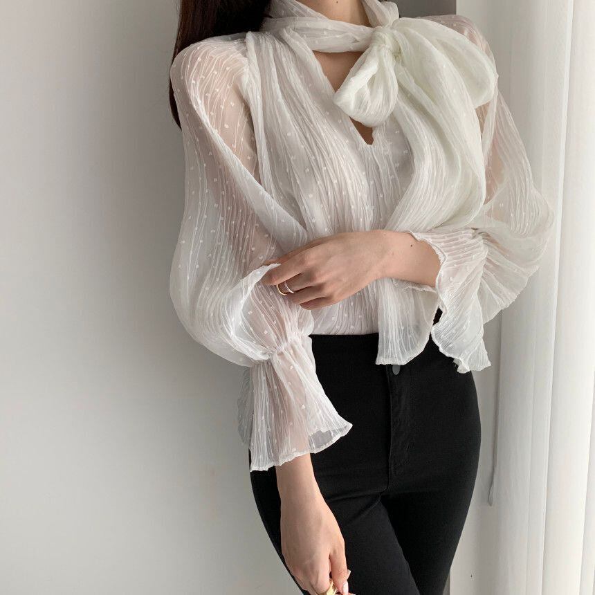 Vネックシフォンシャツ レディーススプリングオータム ロング 春物 秋物 韓国婦人2552399635