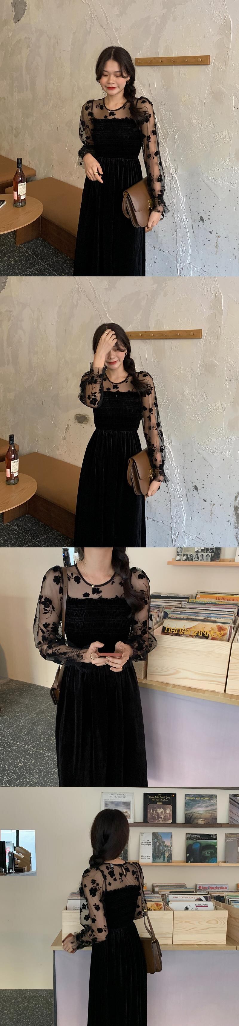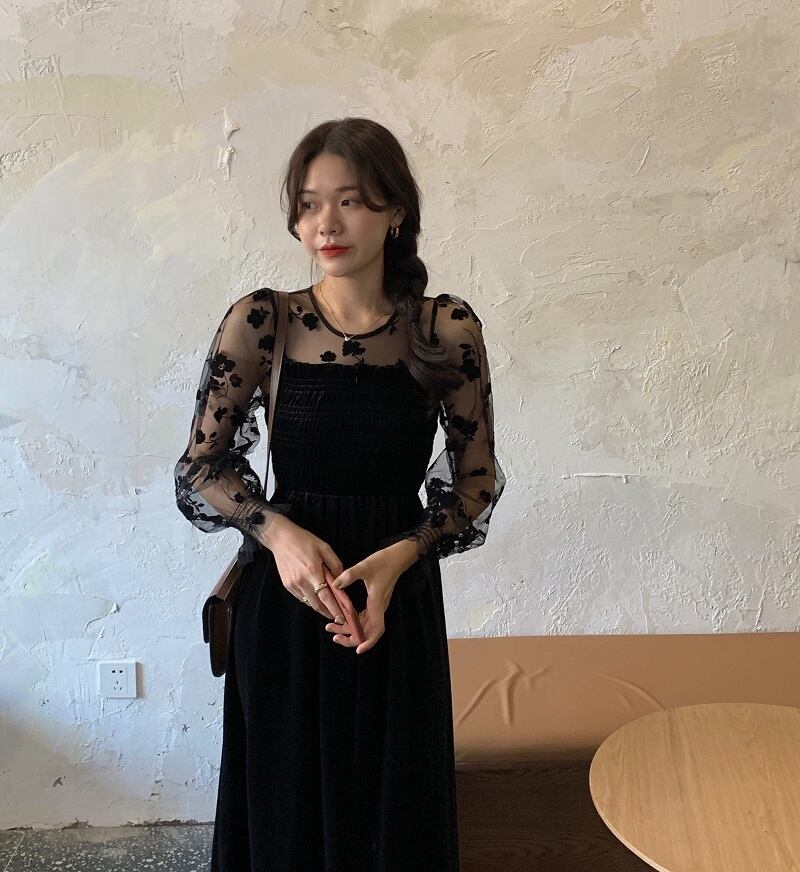 スタイルラウンドネックメッシュベルベットFlowerデザイン スリムドレス Oネック フラワーデザイン ステッチ 韓国婦人53706516648