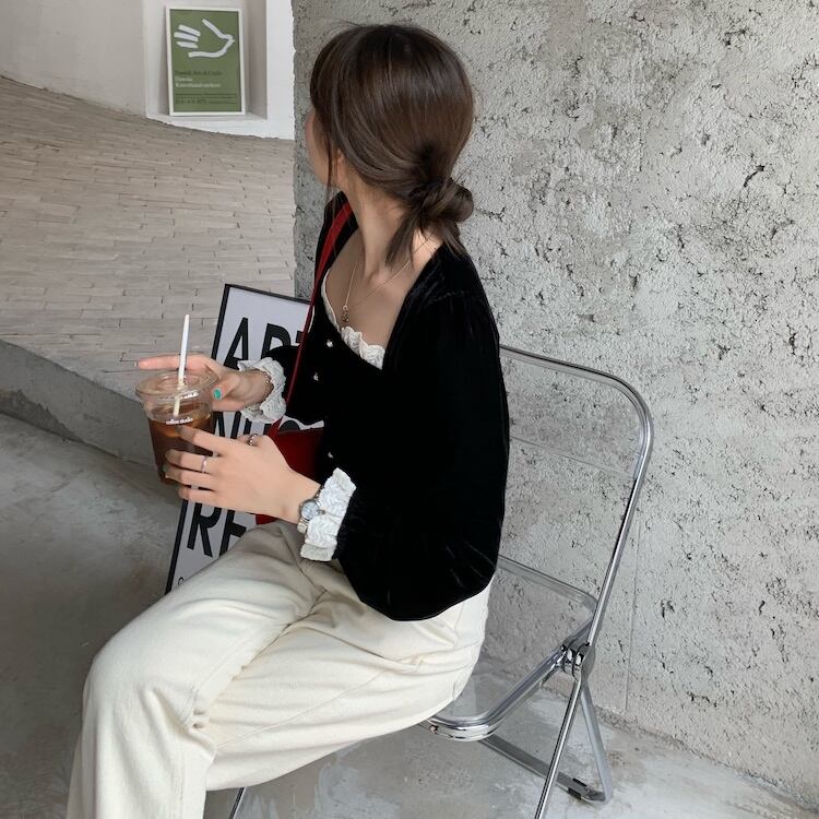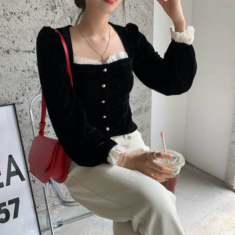 スリーブゴールドベルベットブラウス シャツ スクウェア 韓国婦人18658402144