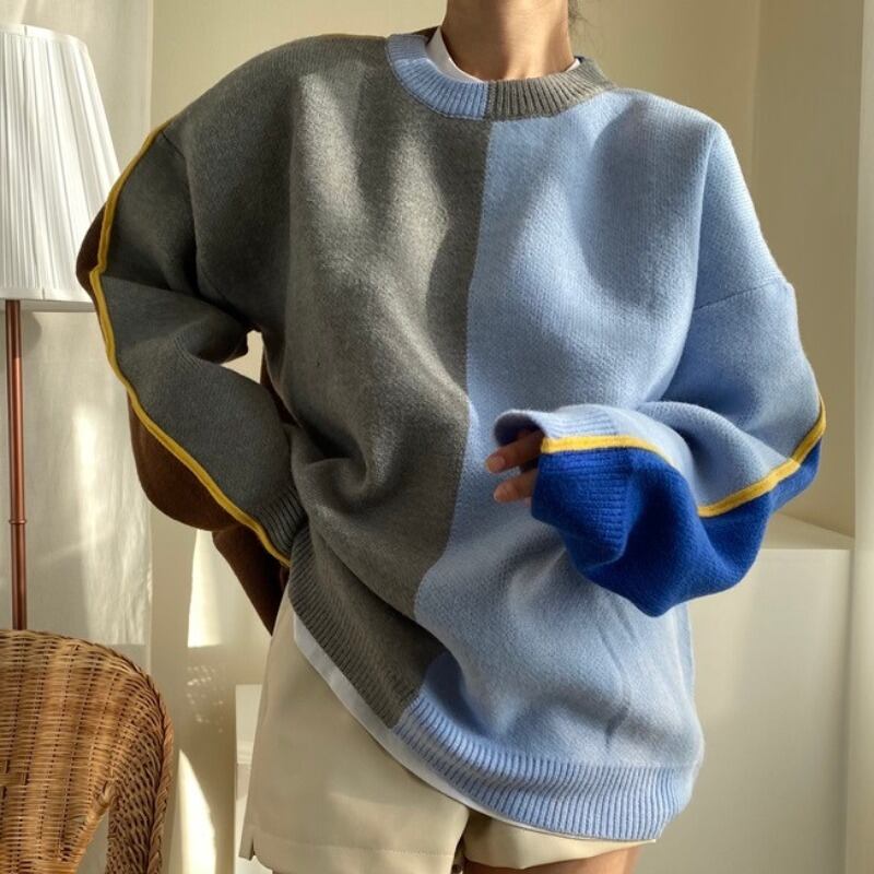 スプリングオータムスタイルルーズラウンドネックプルオーバー セーター トップス レディース 春物 秋物 Oネック ステッチ 韓国婦人40560014126