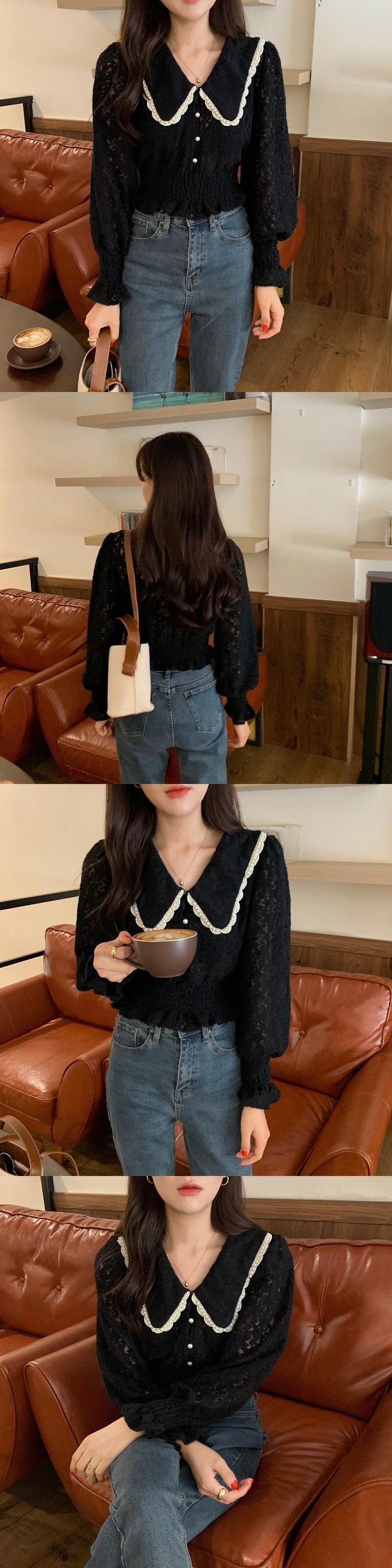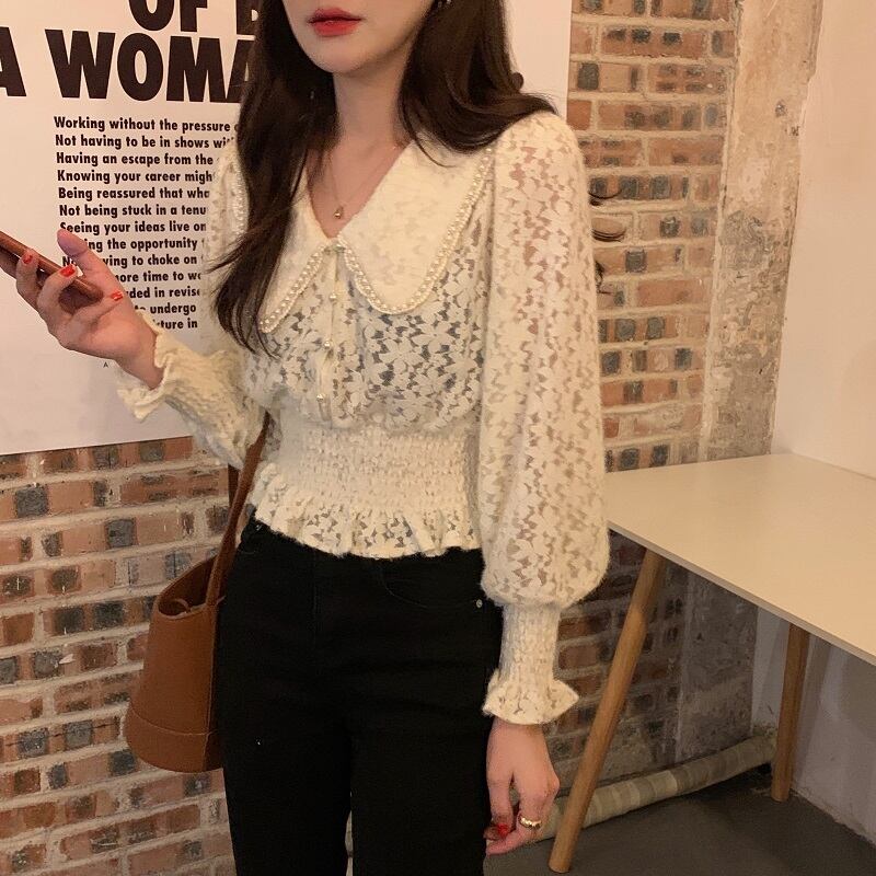 スプリングレーススタイルパールカラースリーブショートウェストスリムトップス ランタンスリーブ 春物 真珠 韓国婦人13966129387