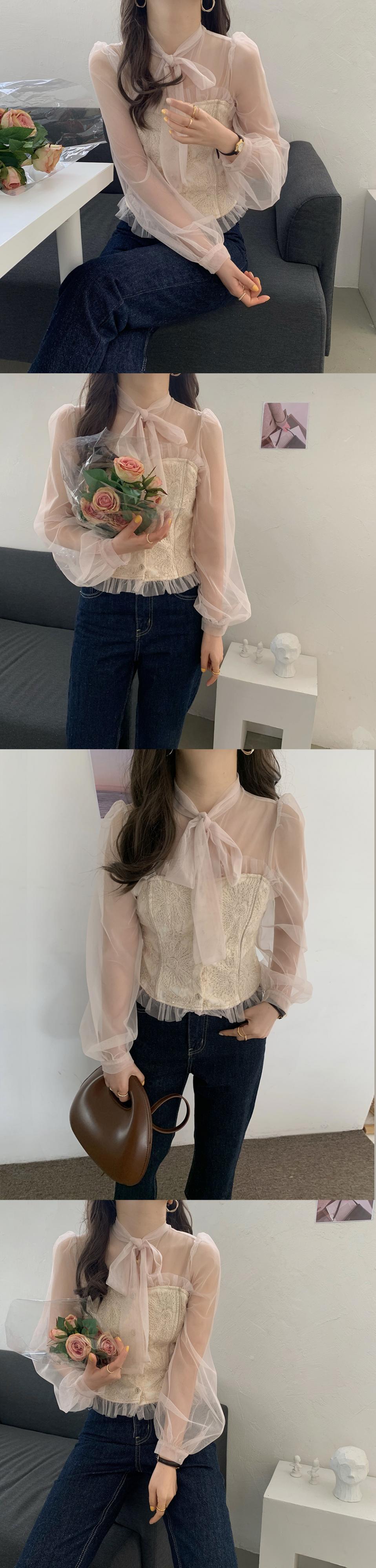 スタンダードスタイルメッシュレースリボンスリーブシャツ レトロ ステッチ 韓国婦人57842829081