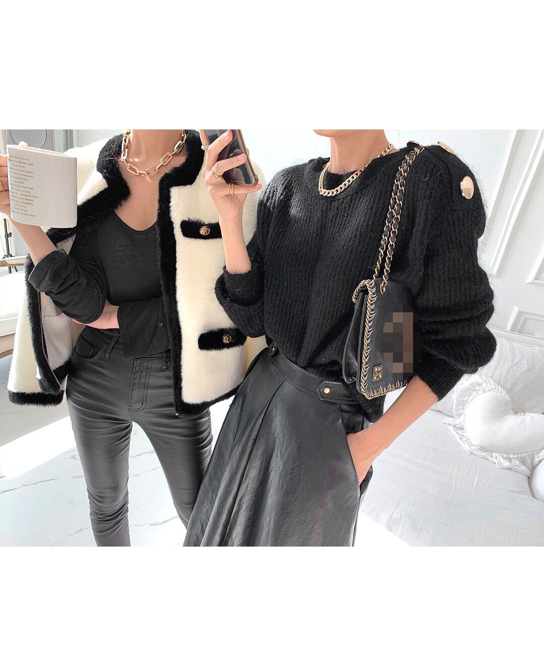 オータムウィンタースタンダードラウンドネックルーズニットセーター ハイウェストウェストレザースカート ロング レトロ 秋物 冬物 Oネック 韓国婦人84002720638