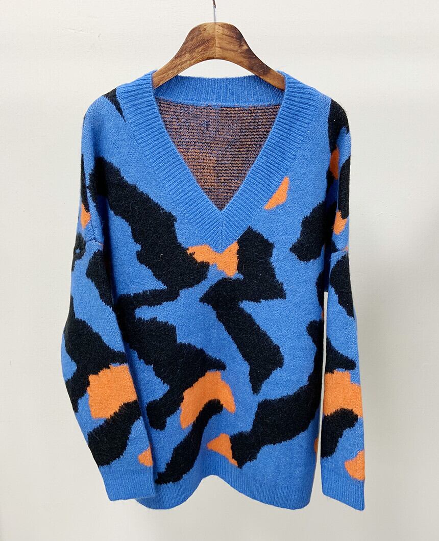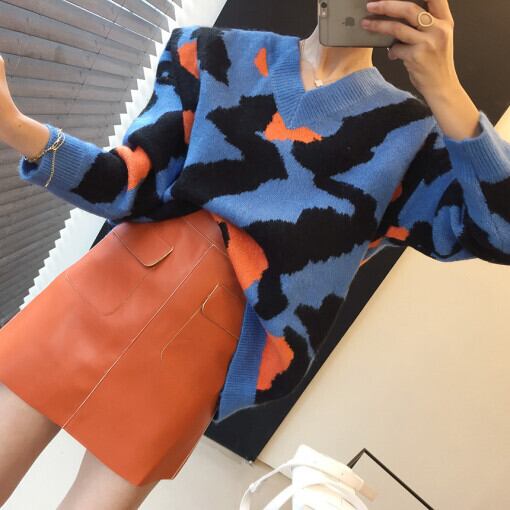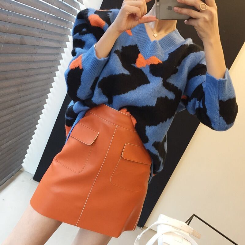 スタンダードVネックカラーレオパードプリント柄プルオーバー セーター ポケットスカート レトロ 韓国婦人43567941272