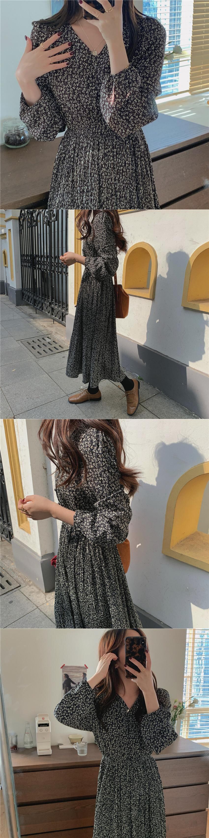 スタンダードVネックフローラルドレス 薄手プリーツスカート レトロ 花柄 韓国婦人32682503795