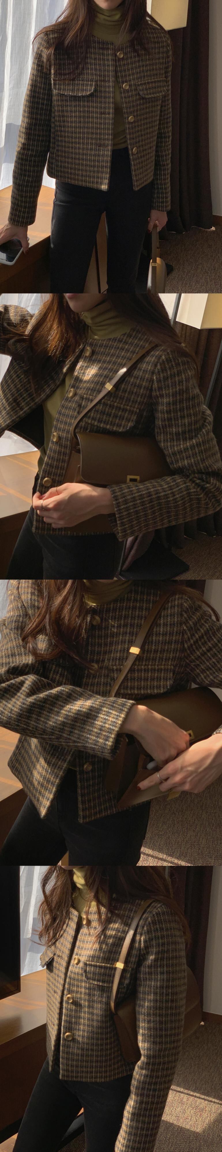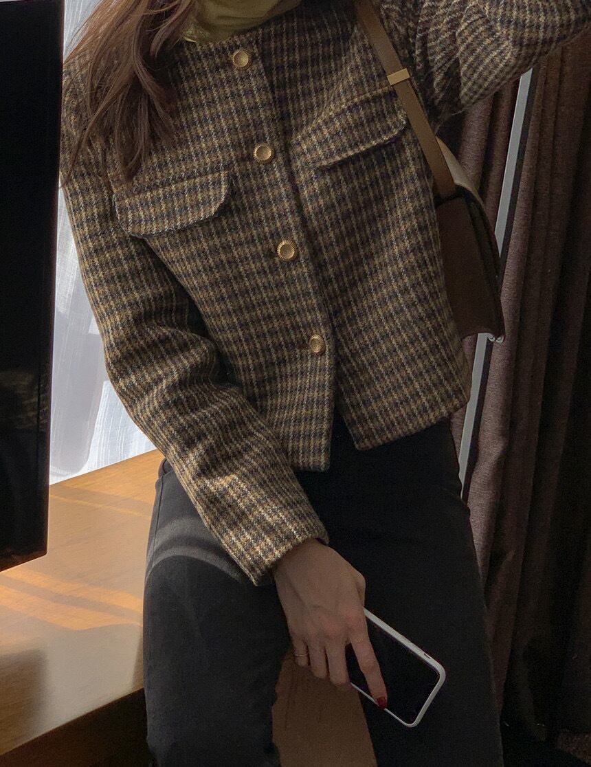 スタンダードラウンドネック格子柄ショートコート カラースリムシャツ レトロ Oネック 韓国婦人25345889875