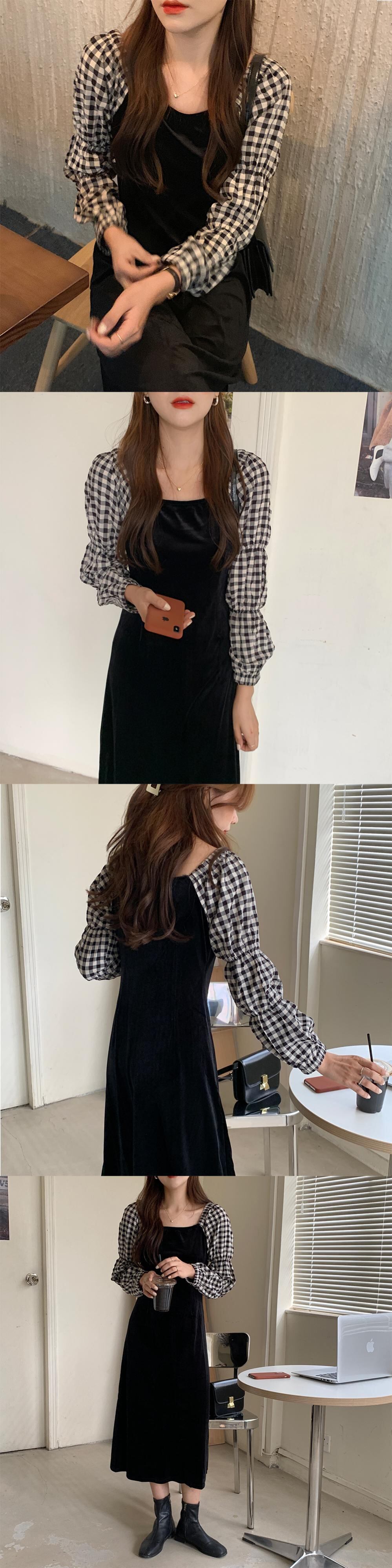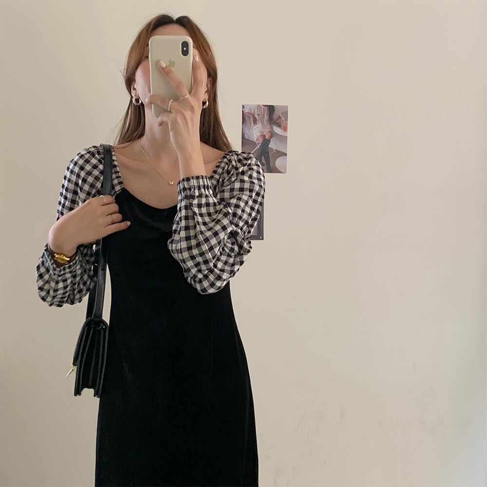 スリム格子柄ロングベルベットスカート エレガント スクウェア ステッチ 韓国婦人44787015673