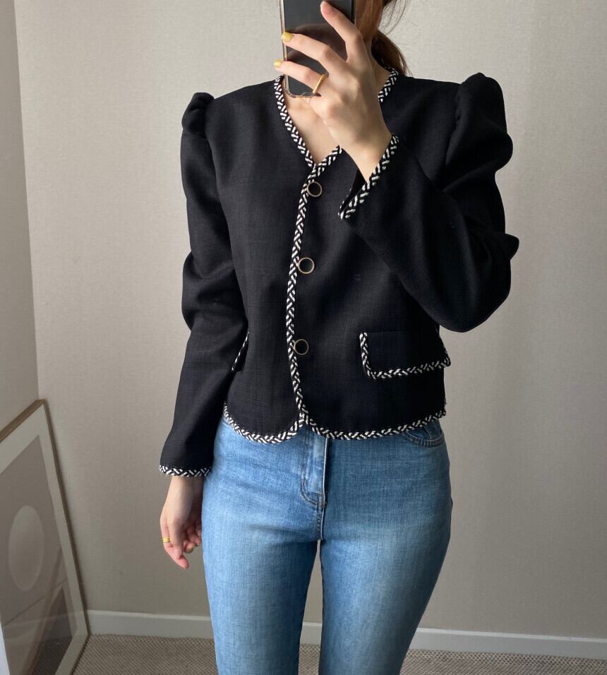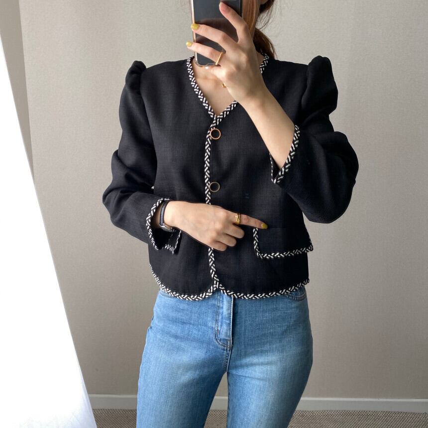 スプリングオータムスタンダードVネックカラールーズスリーブショートジャケット レトロ 春物 秋物 韓国婦人88785327977