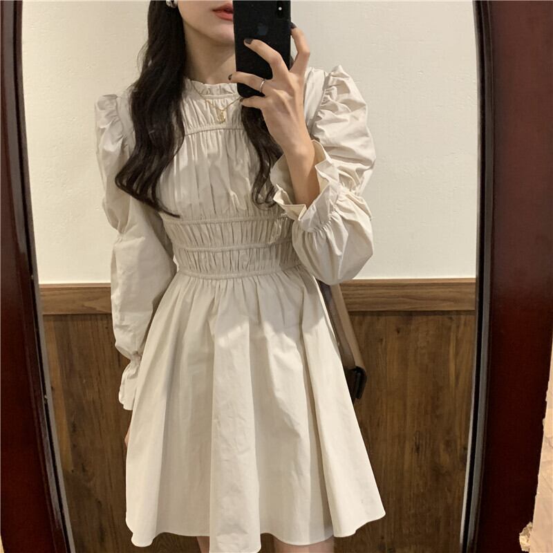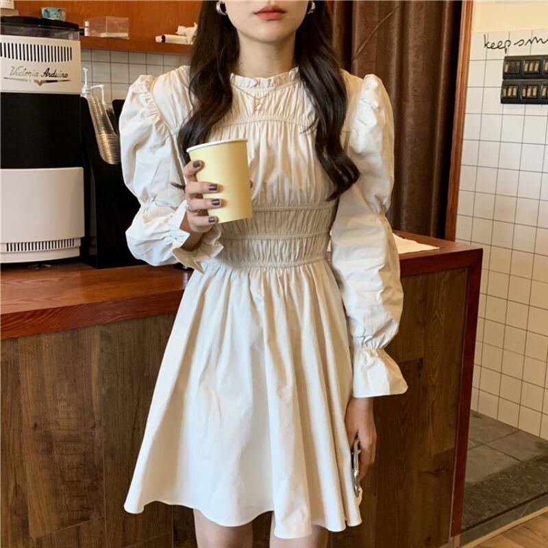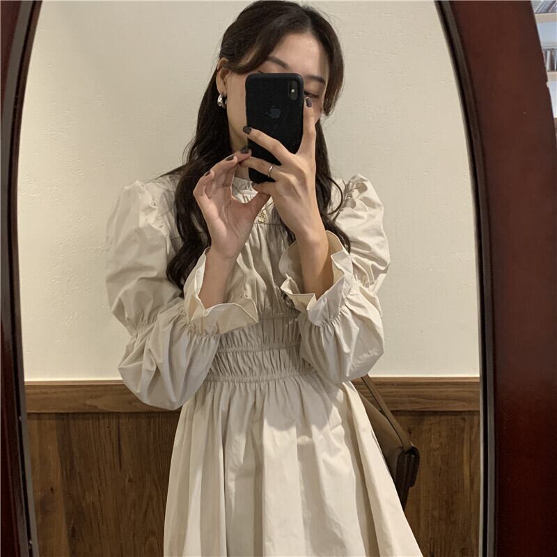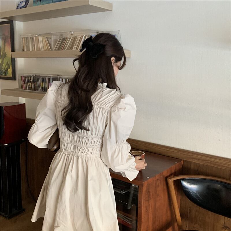 スタンダードスタイルスタンドカラーカラースリーブウェストドレス レトロ レース 韓国婦人80907283362