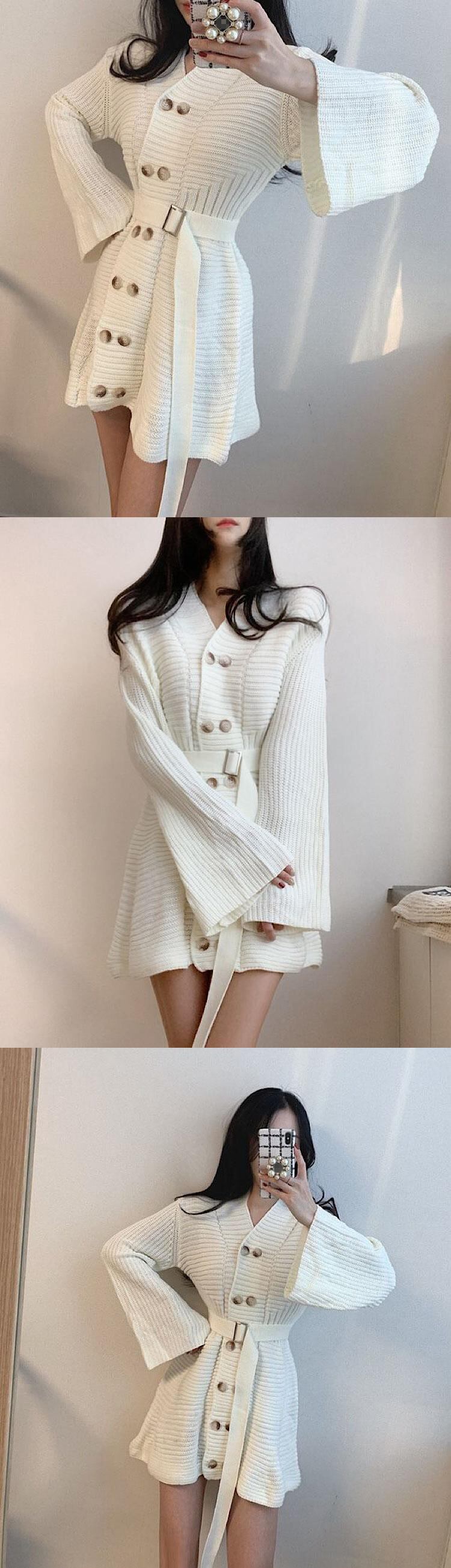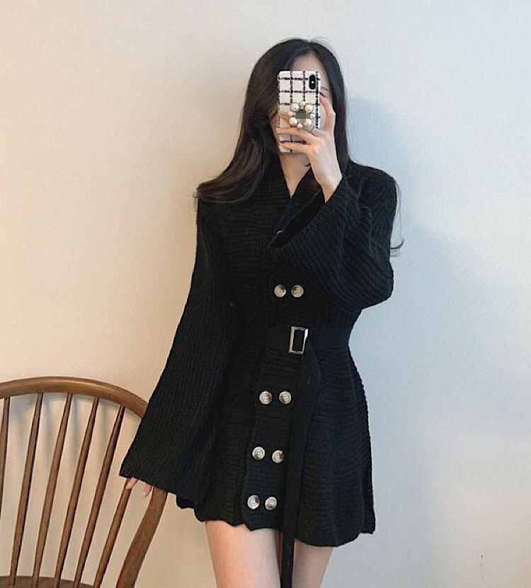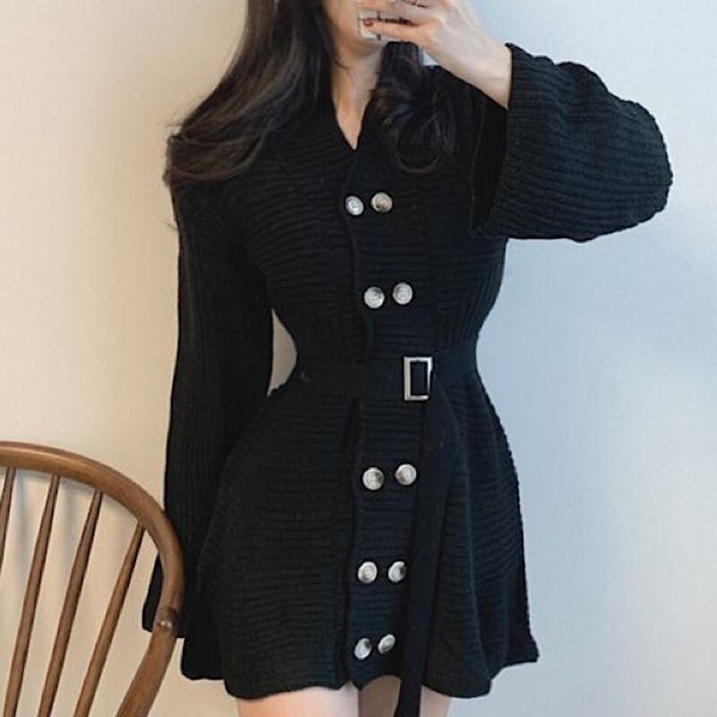 ダブルブレストスタンダードセーター ドレス レトロ ハーネス ベルト 韓国婦人90326078934