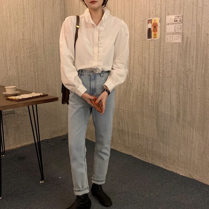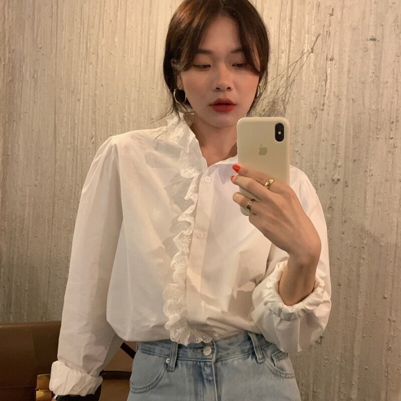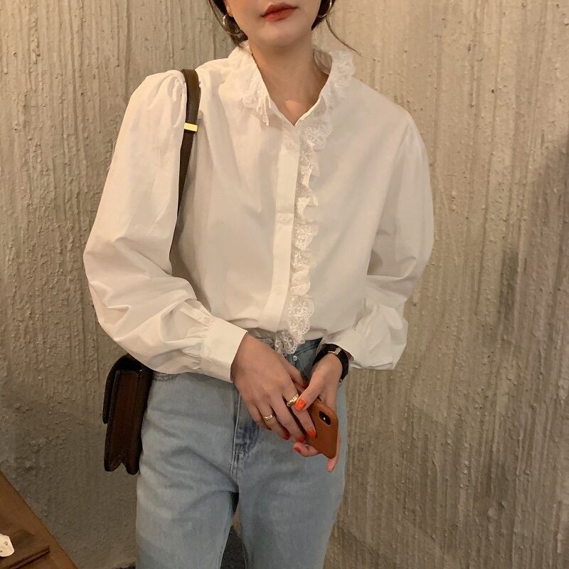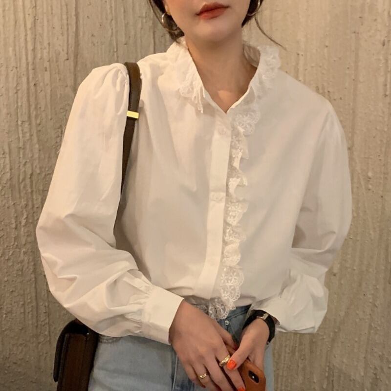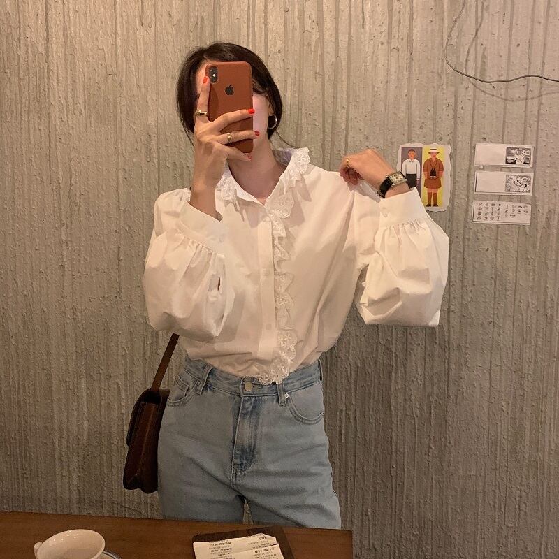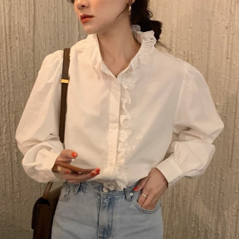スプリングカラーレーススリーブソリッド シャツ レディース ランタンスリーブ 大人ガーリー スウィート キュート カジュアル 春物 ソリッドカラー 韓国婦人39513764263