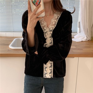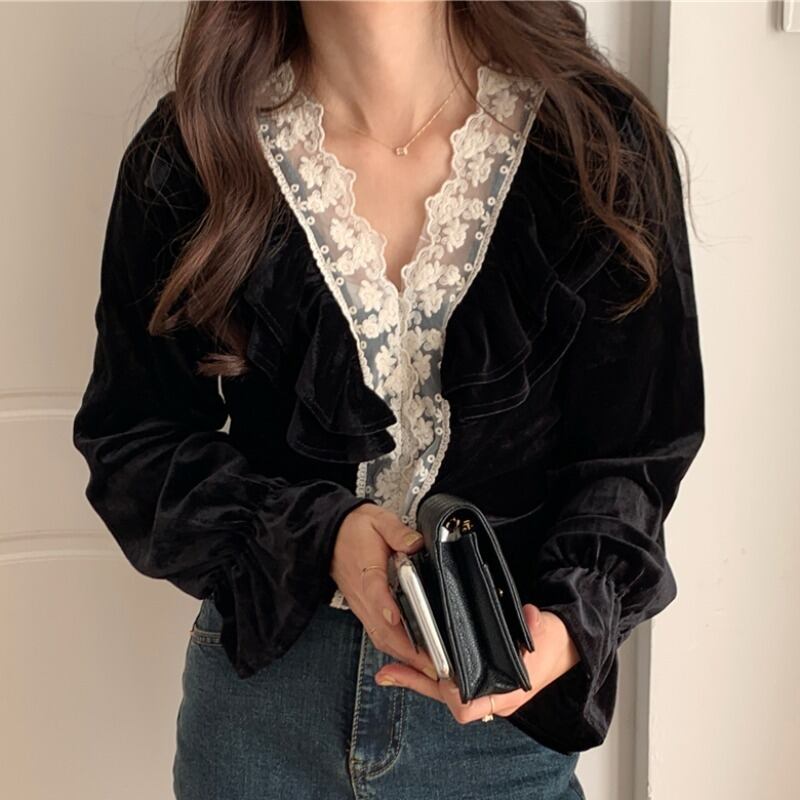 スタイルカラーレースVネックブラックベルベットシャツ レディース レッド エレガント ステッチ 韓国婦人61553976596