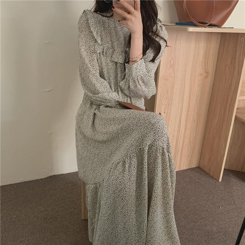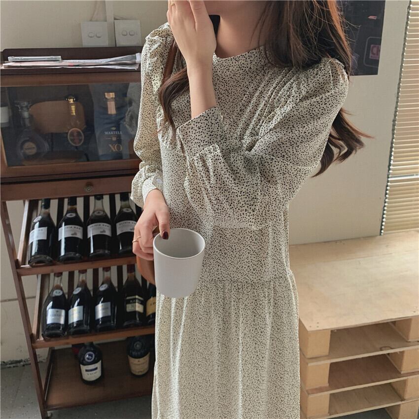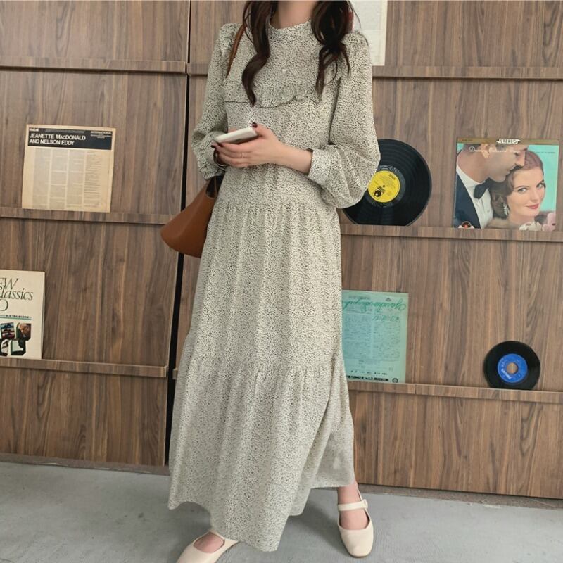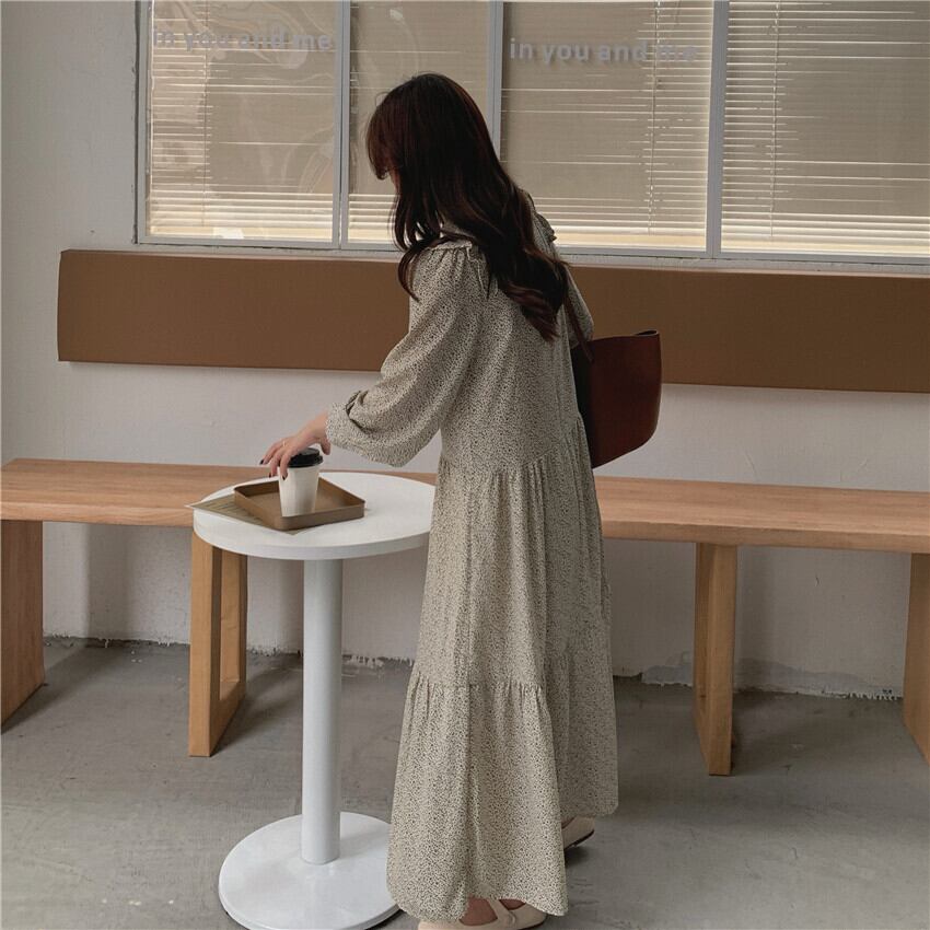 スタンダードフローラルドレス ウェスト薄手スプリングオータム ロング レトロ 春物 秋物 花柄 韓国婦人54259719889