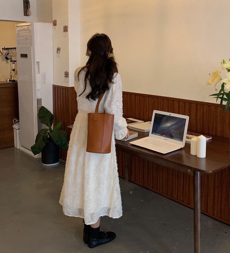 スプリングオータムスタイルVネックハイウェストウェストソリッド カラードレス ロングスカート レディース レース 春物 秋物 ソリッドカラー 韓国婦人26882969348