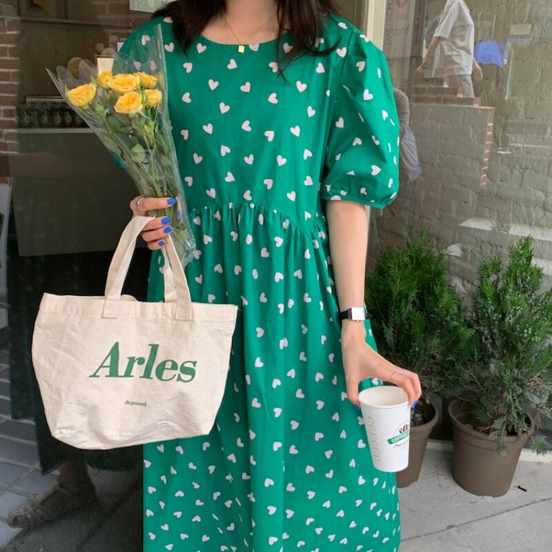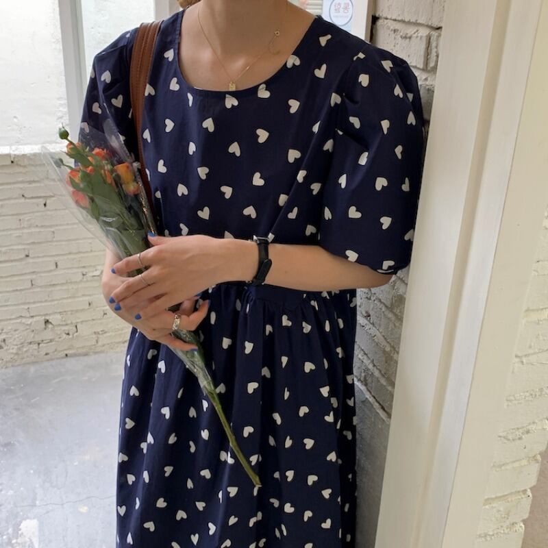 パターンプリントスタンダードカラースリーブルーズドレス サマーロングスカート レトロ 夏物 韓国婦人17671796393