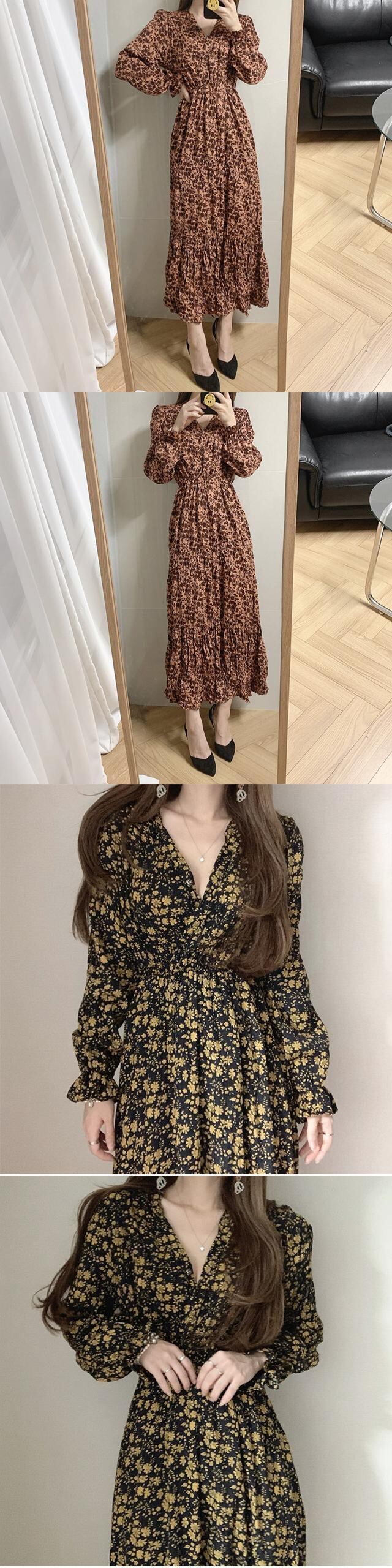 オータムウィンタースタンダードクロスVネックプリーツウェストフローラルスリーブドレス レトロ 秋物 冬物 花柄 韓国婦人58557601010