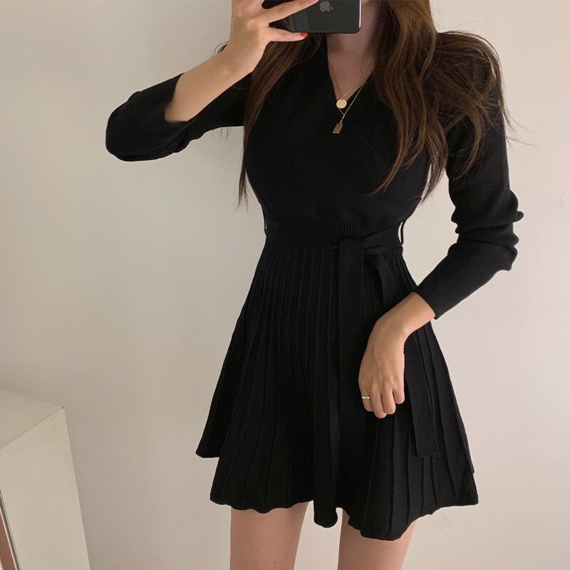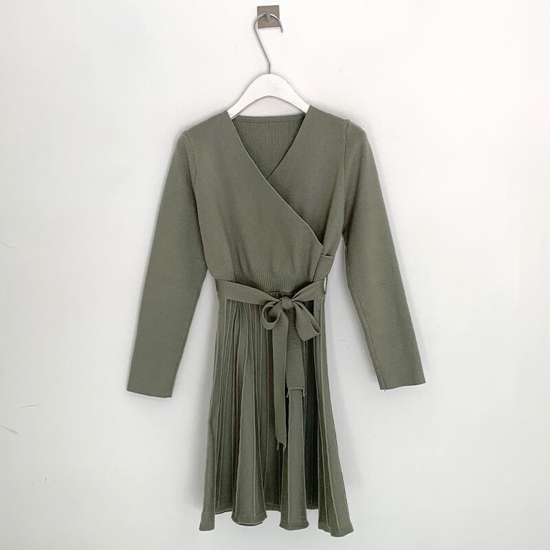 オータムVネッククロスサイドレースニットウェストプリーツドレス レディース 秋物 韓国婦人32537082969