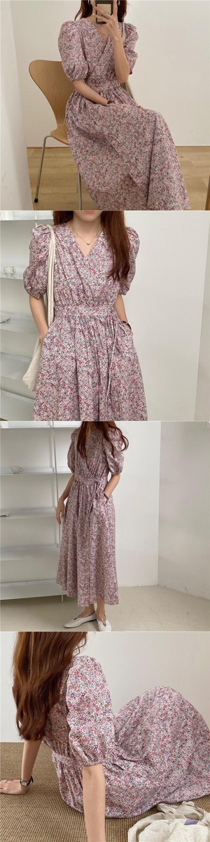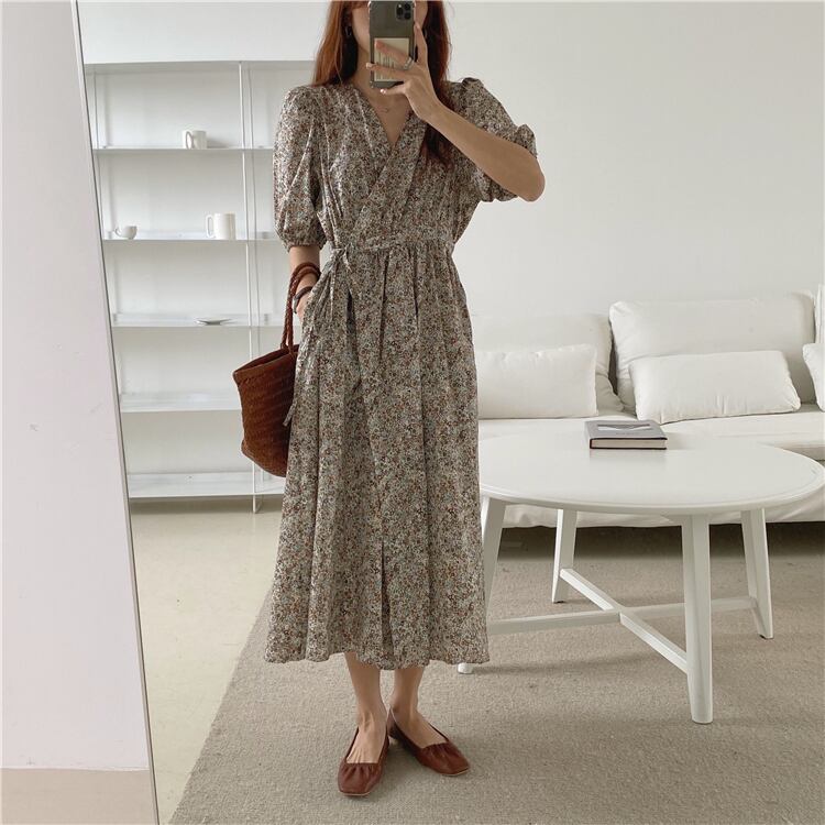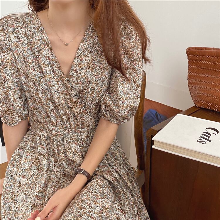 サマースタイルスタンダードフローラルVネックドレス ワンピーススリーブロングスカート レディース レトロ 夏物 花柄 韓国婦人29256719406