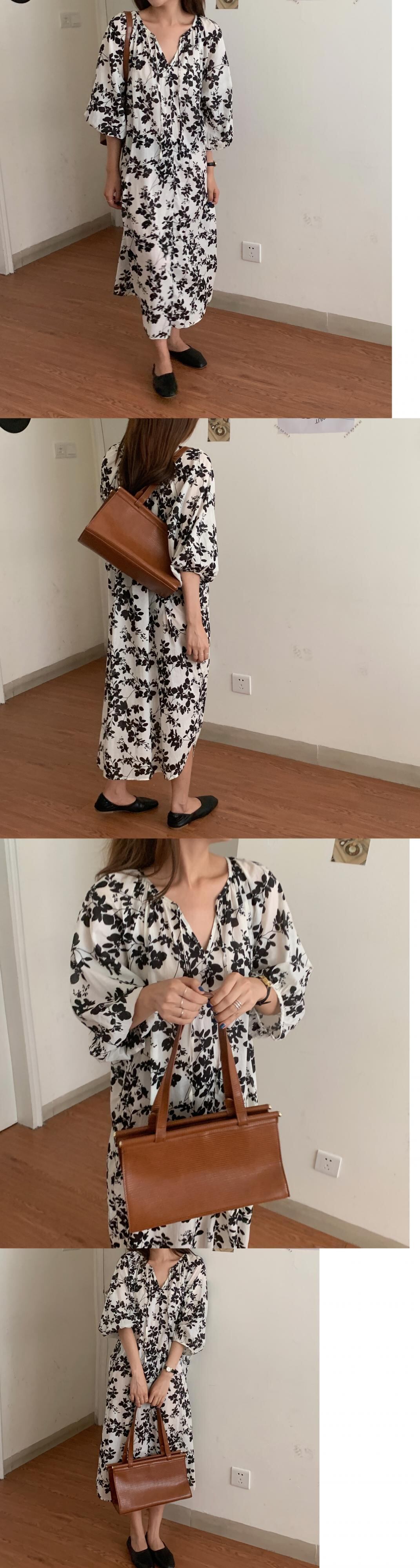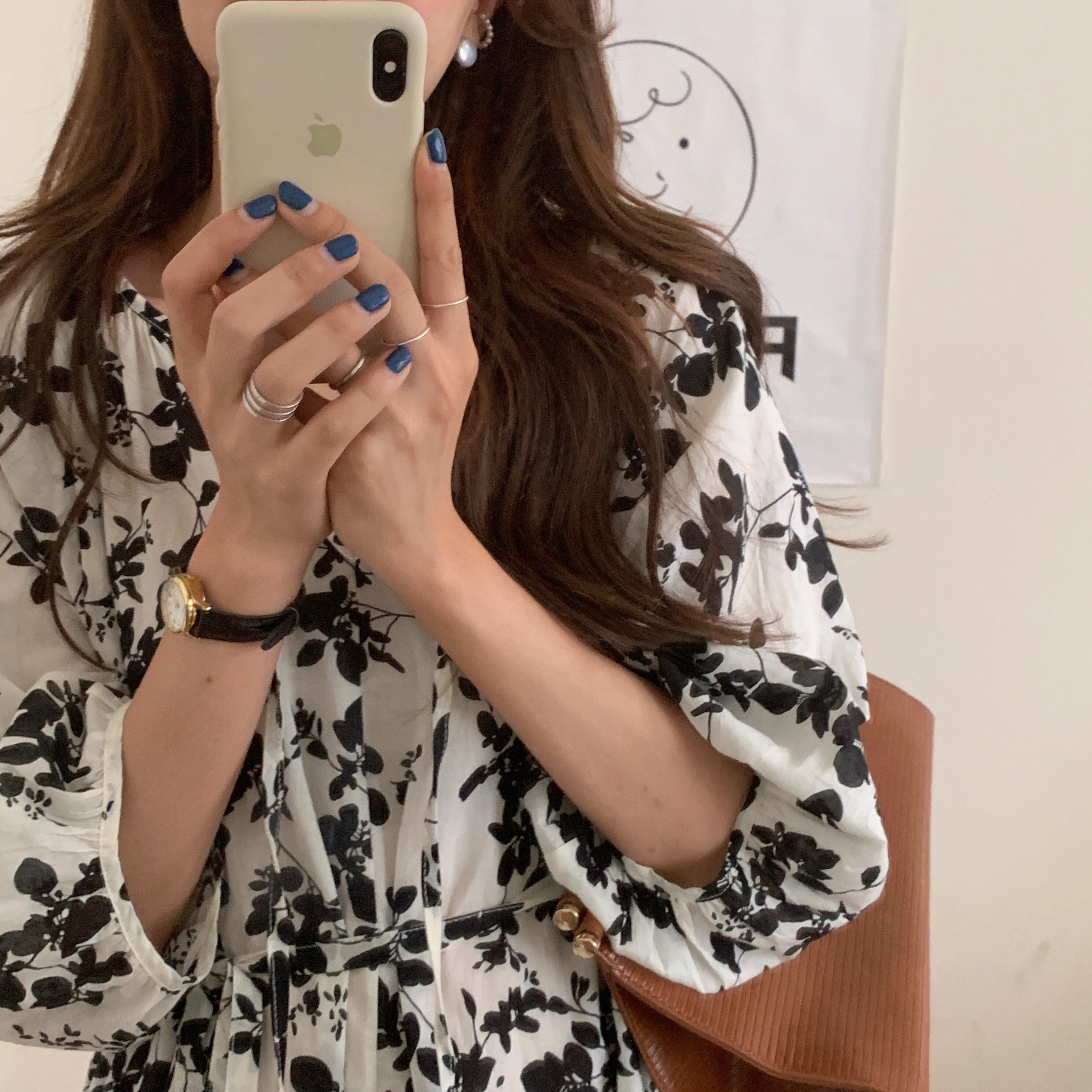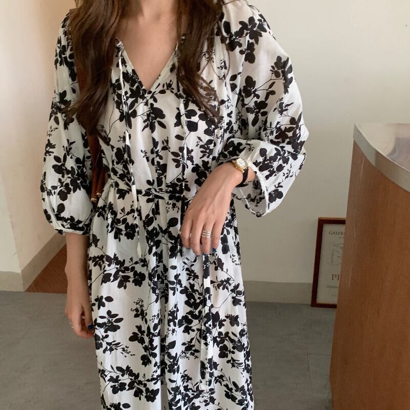 ドレス スプリングスタンダードブラックホワイトフローラルスリーブルーズ薄手スカート レトロ 春物 花柄 韓国婦人76102989666
