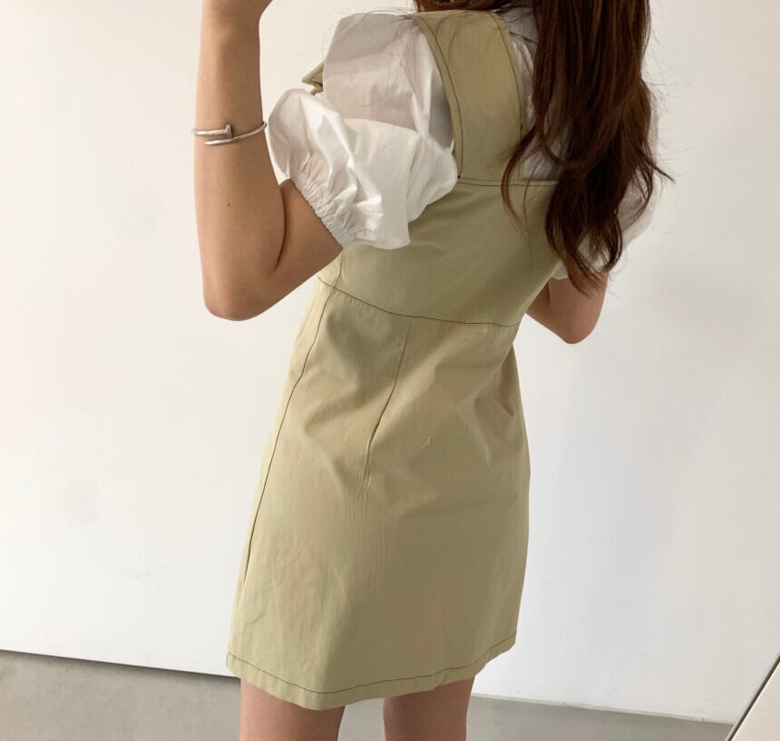 色:白のシャツ,カーキストラップドレス,ブラックストラップドレス