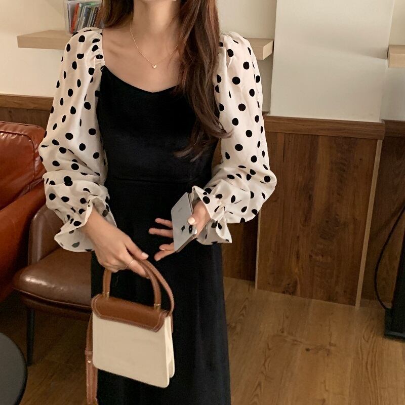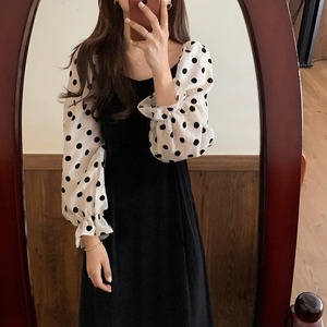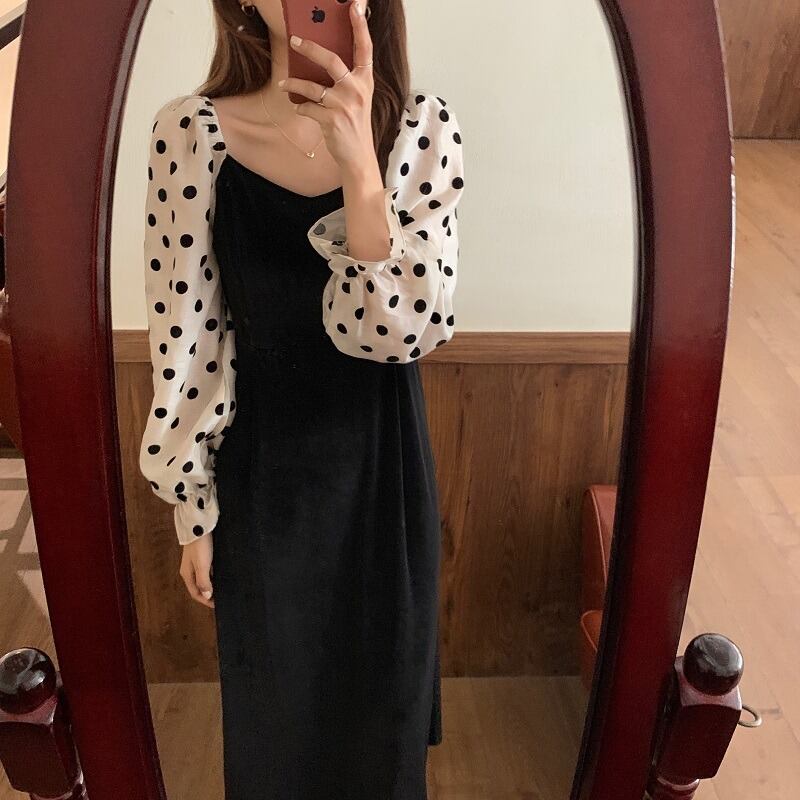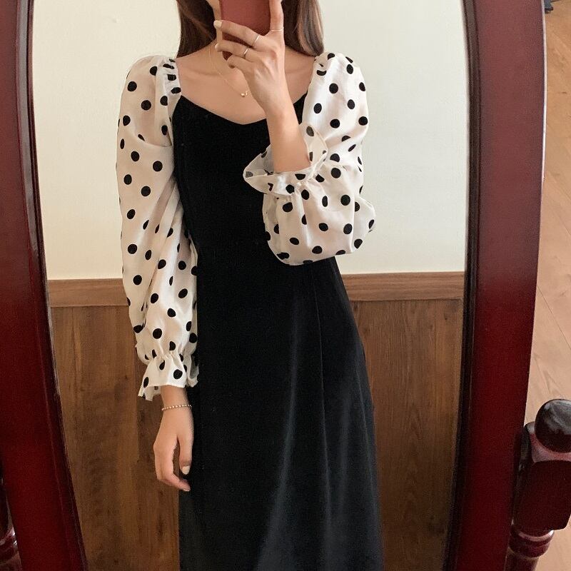 スプリングカラー水玉スリーブゴールドベルベットスタンダードスリムドレス レトロ レース 春物 スクウェア 韓国婦人93562107227