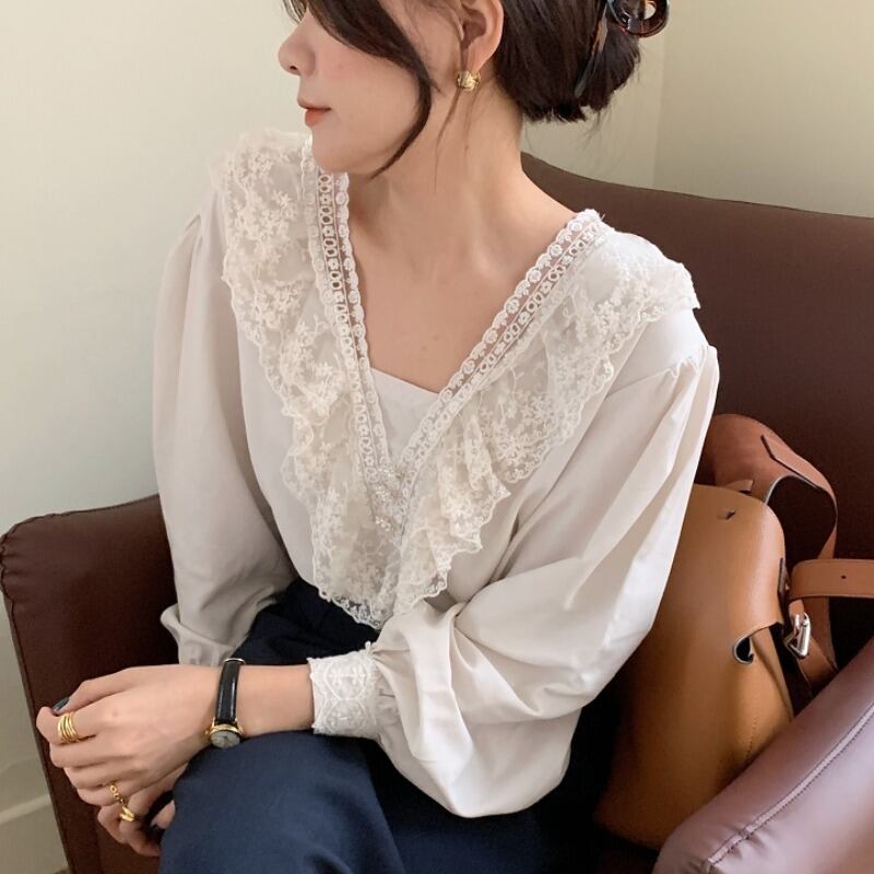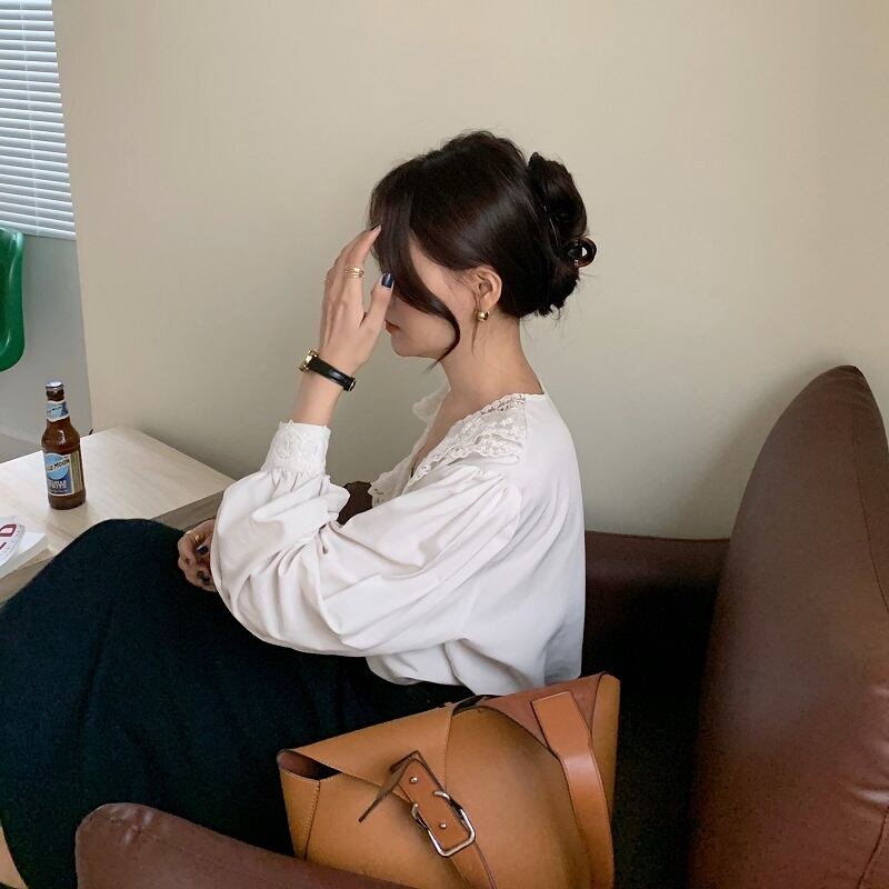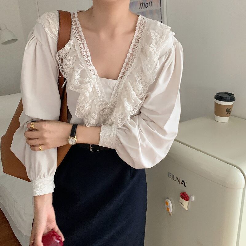 スプリングスタイルレースカラーシャツ パールボタンレディース ロング 春物 真珠 韓国婦人13820258557