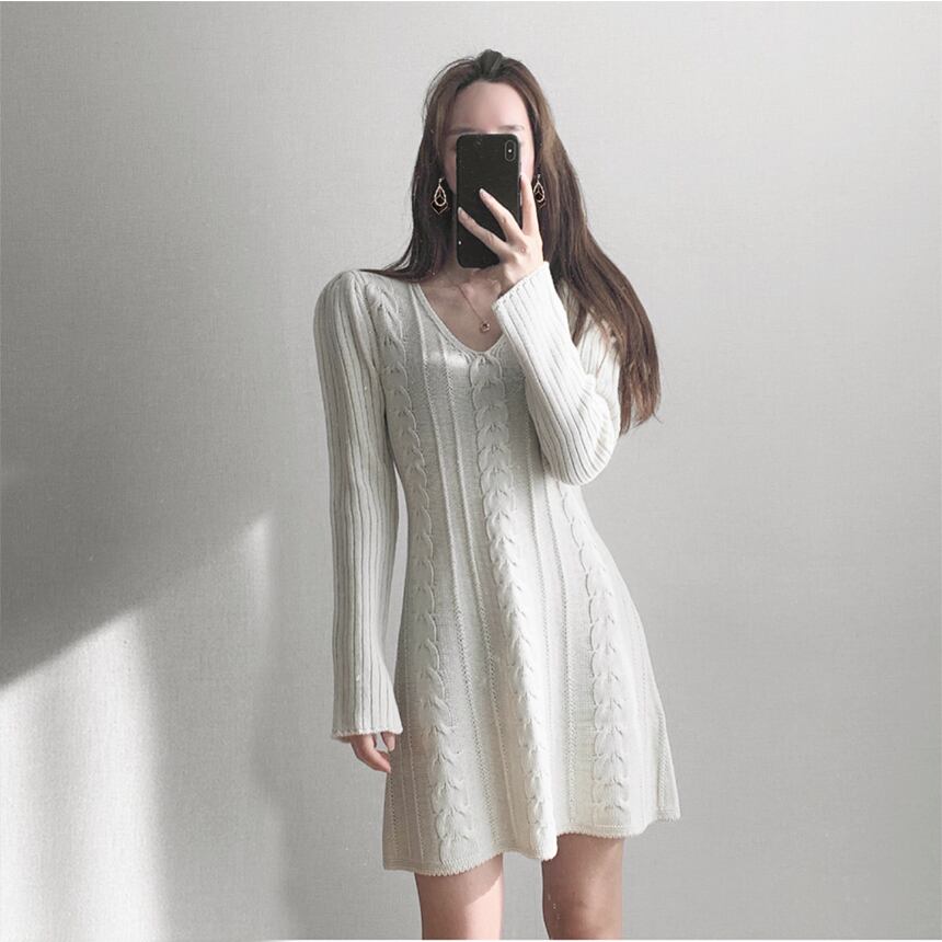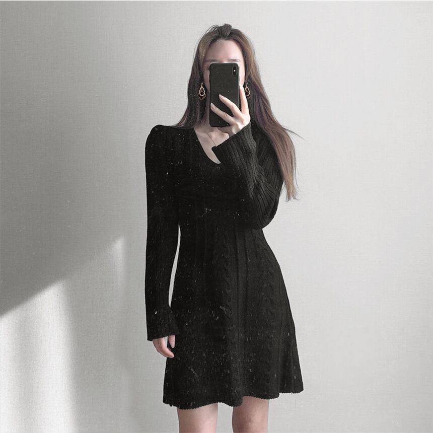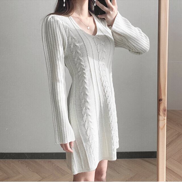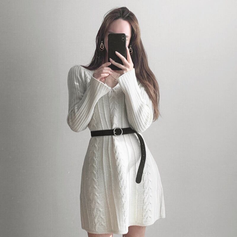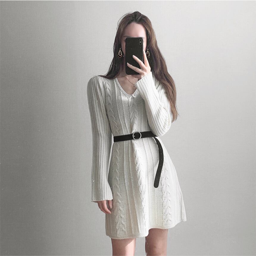 Vネックニットドレス オータムウィンター薄手ウェストセーター スカート ベルト 秋物 冬物 ハーネス 韓国婦人48426558628
