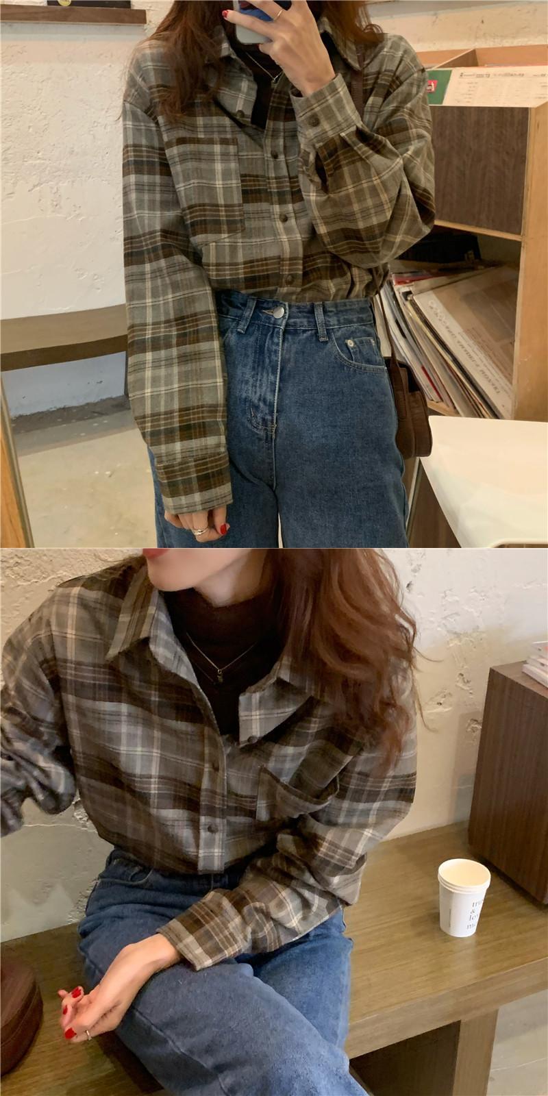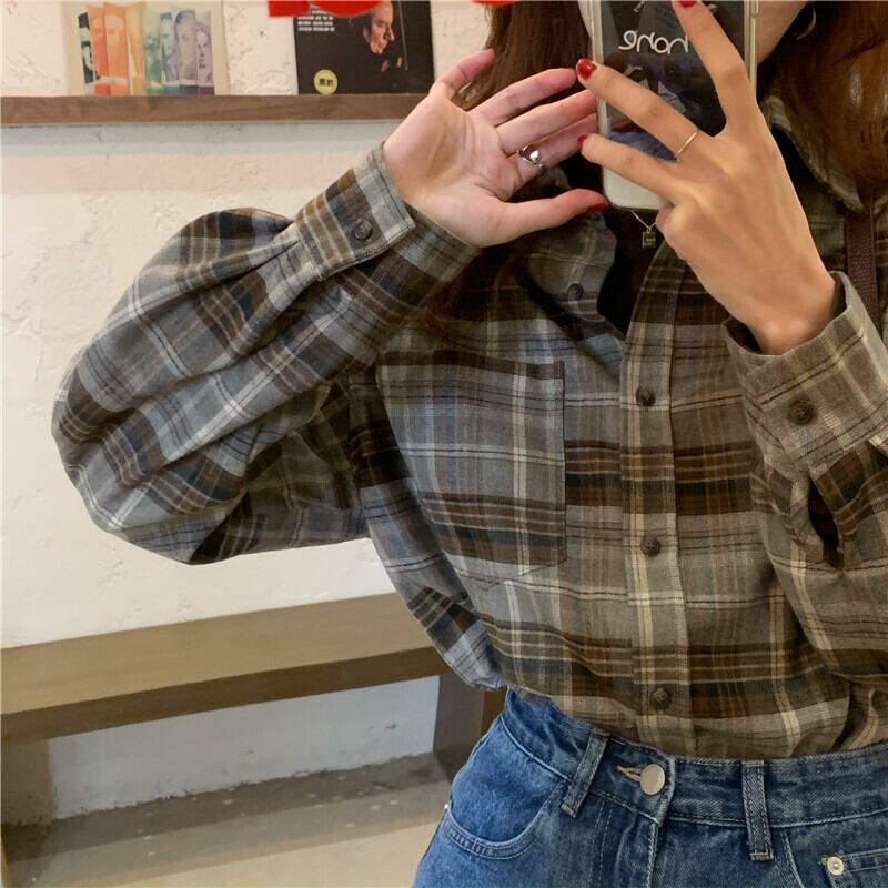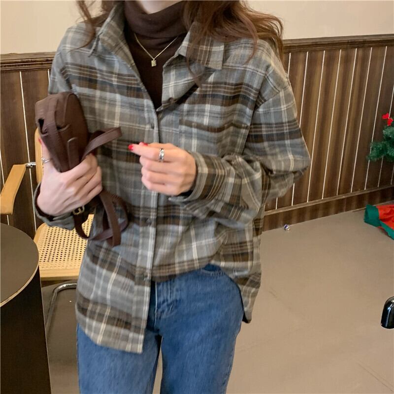 スタンダード格子柄シャツ ブラウス レディース ロング レトロ 韓国婦人2162517099